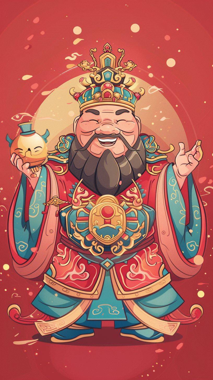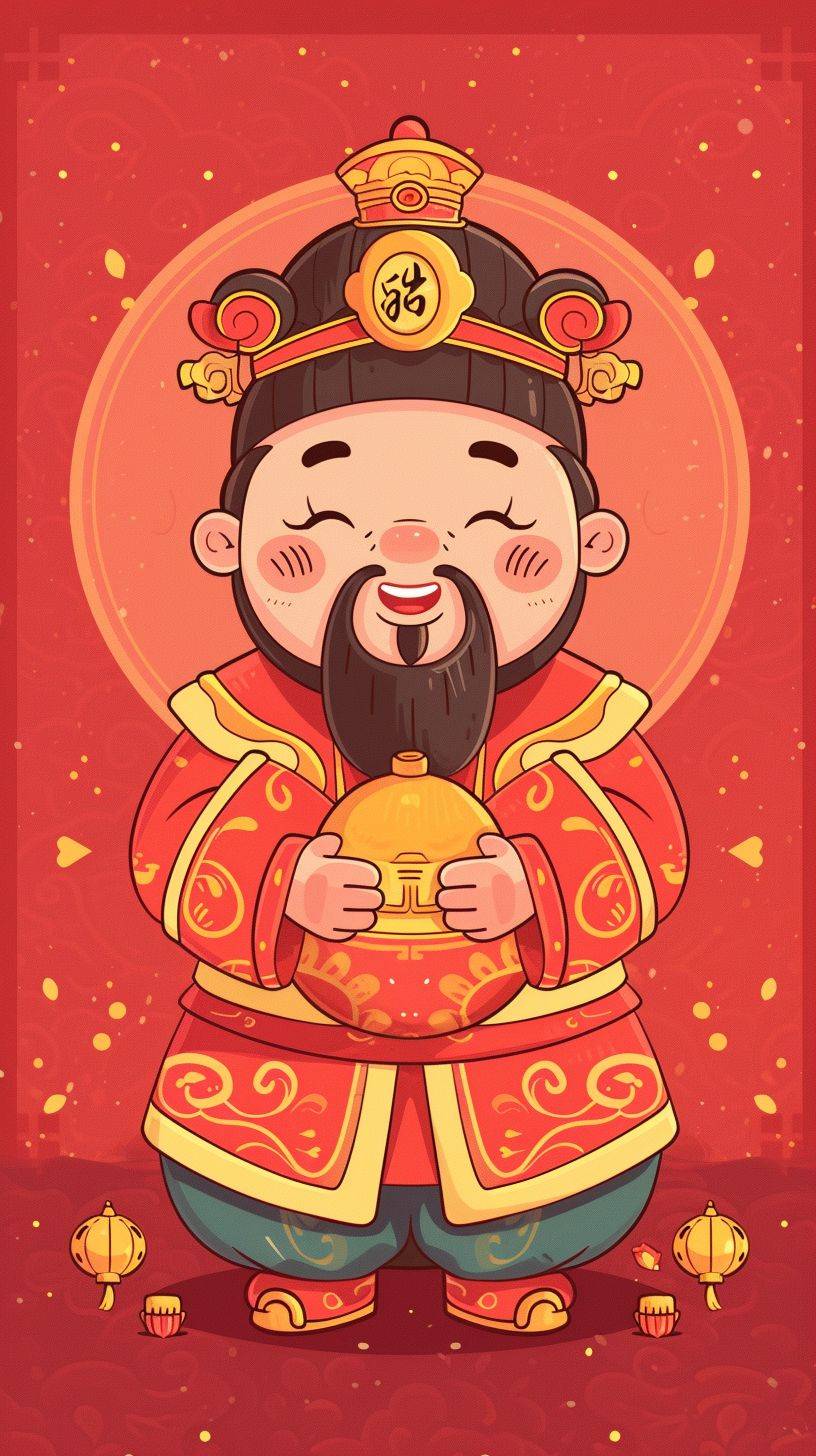 Cute Chinese God of Wealth, hand-drawn in a sketch style, holding a shiny large ingot in hand, with a smiling face. The artwork features a minimalist design with a simple and clean light red background. It is a full-body portrait with bright lighting and soft, sophisticated colors. The illustration is in a cartoon style with intricate details. --ar 9:16 --v 6