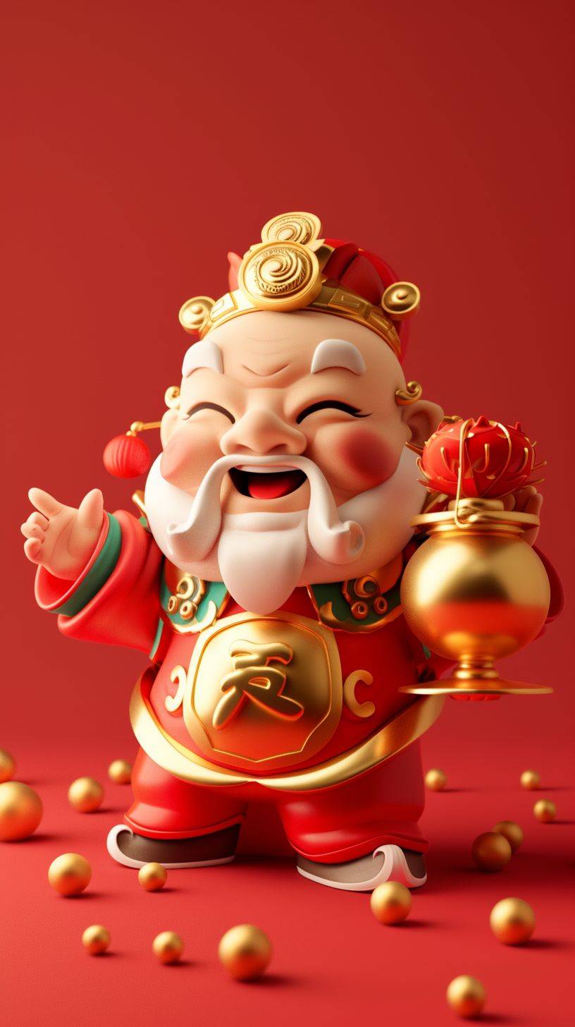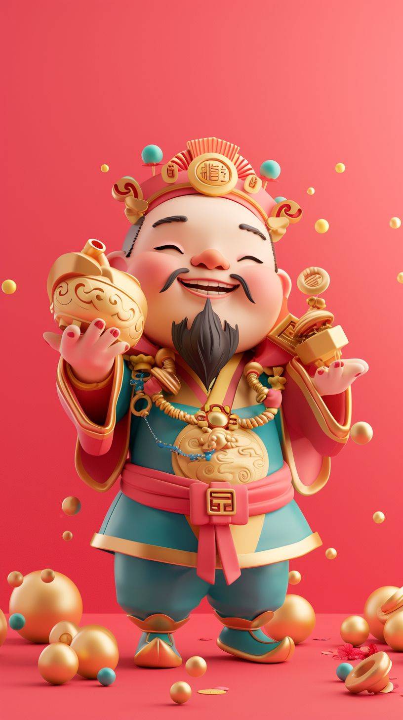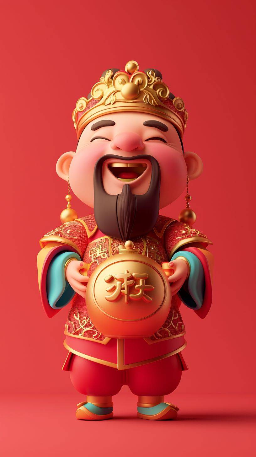 Cute Chinese God of wealth, Chinese door God, holding a large shiny gold ingot in his hand, smiling, minimalist style, simple and clean light red background, full-length portrait, movie lighting, volume light, soft and advanced colors, Pixar style, Bubble Mart, 3D, C4D, blender, chibi, dribble, Pinterest, ultra detail, ultra precision, 8k --ar 9:16 --v 6