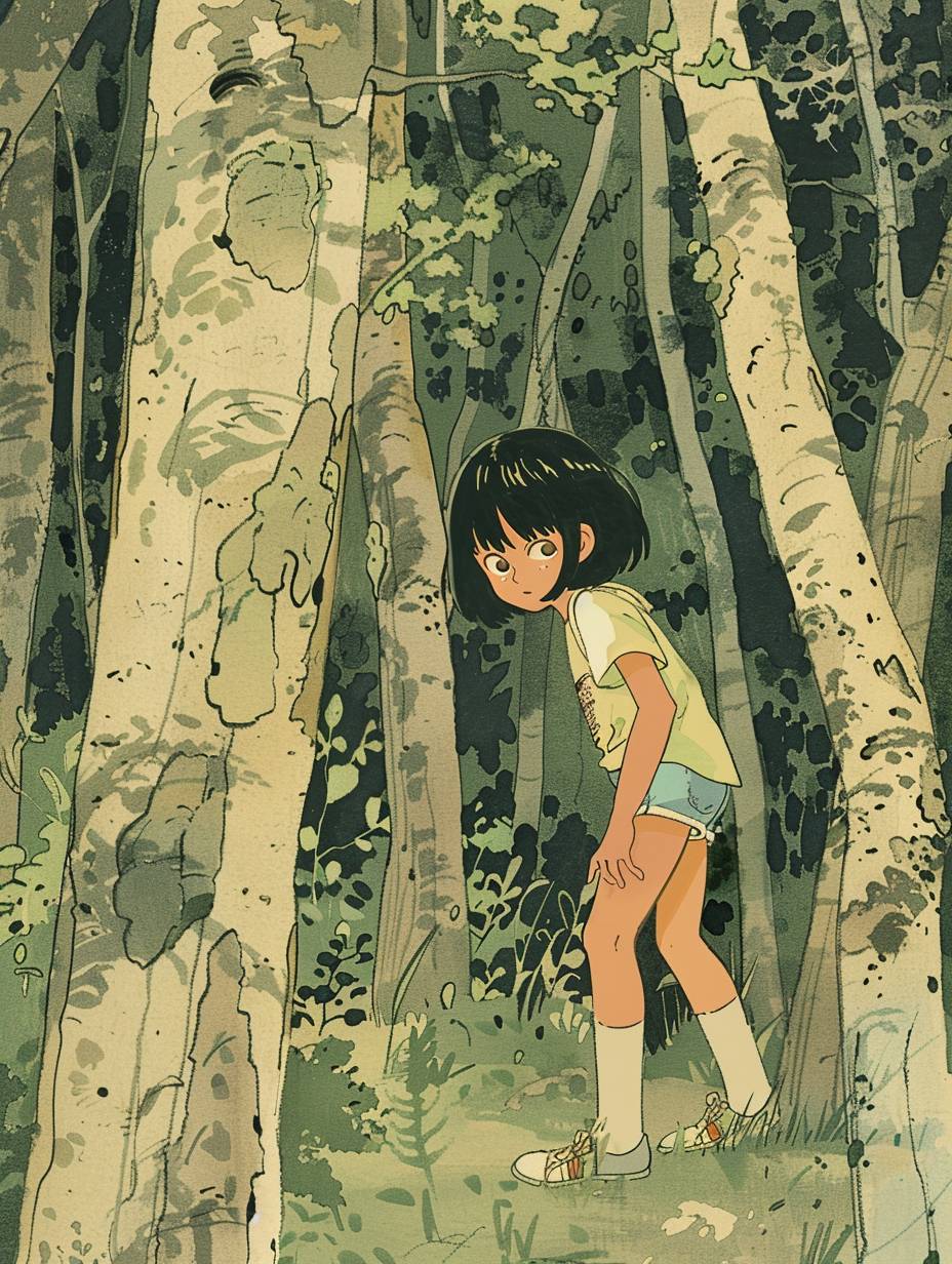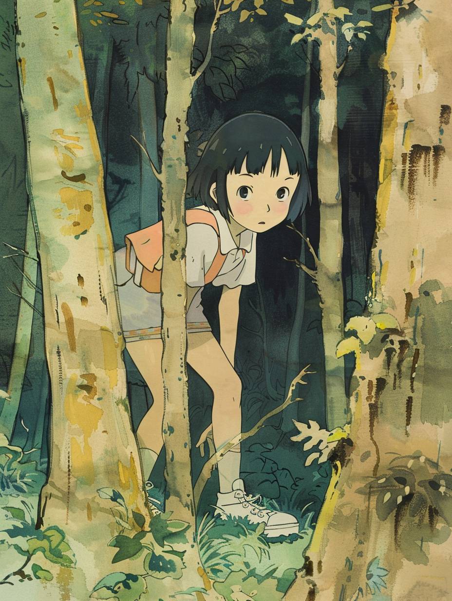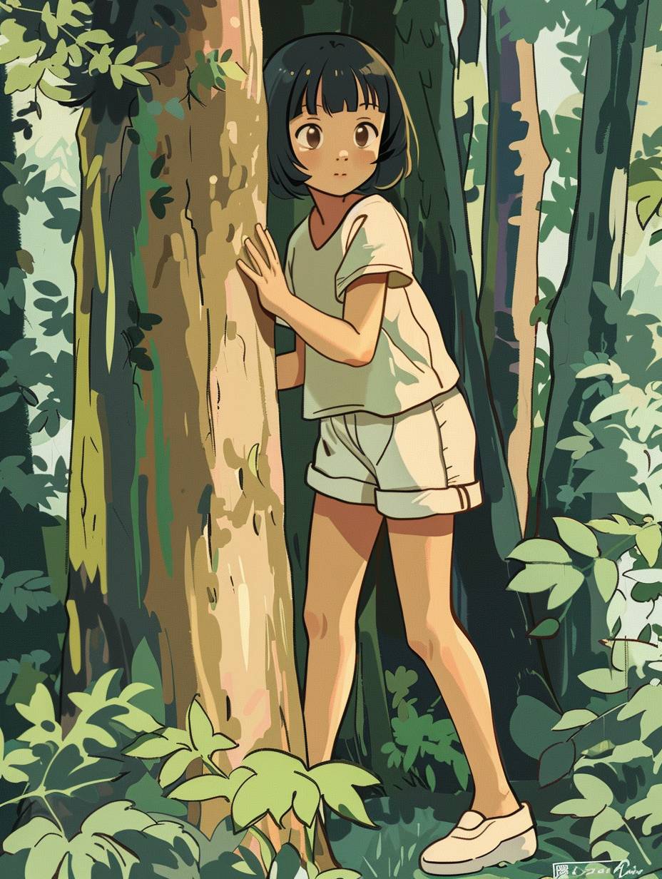 A young girl with short black hair, wearing white shoes and shorts, is playing hide-and-seek in the forest by peeking behind trees, in the style of Hayao Miyazaki, with a simple background, in the style of Japanese anime, with light green and yellow tones, as a cartoon illustration, as a full body portrait in a closeup shot, at a high resolution, with super detailed details, bright colors, cute expressions, and joyful emotions.