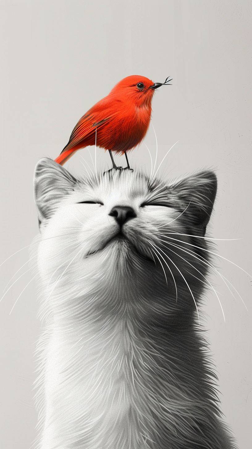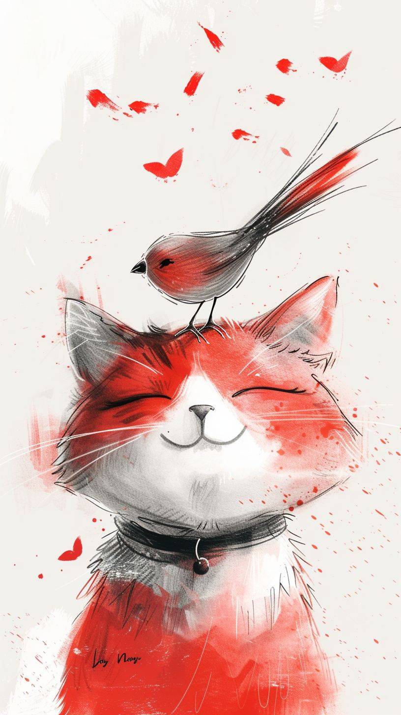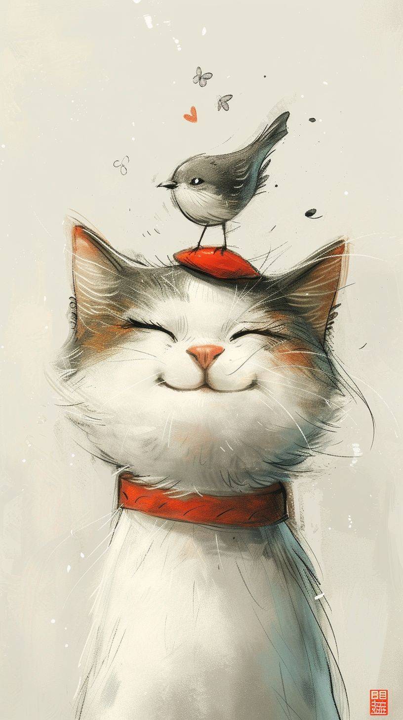 joyful cat with a bird on its head by joey moya, in the style of minimalistic drawings, white background, ultrafine detail, creative commons attribution, mori kei, painted illustrations, serene faces --ar 9:16 --v 6 --stylize 250 --iw 2