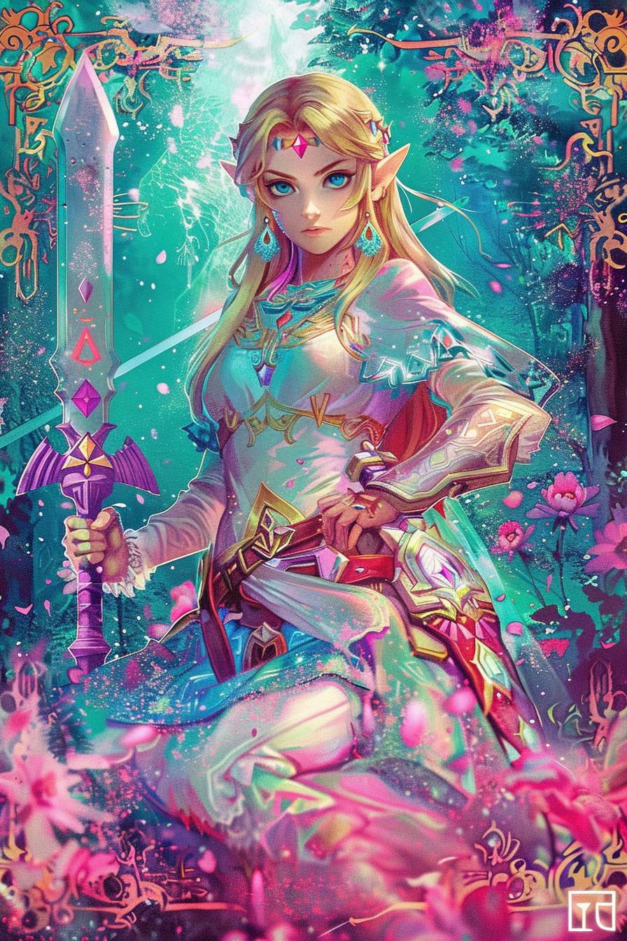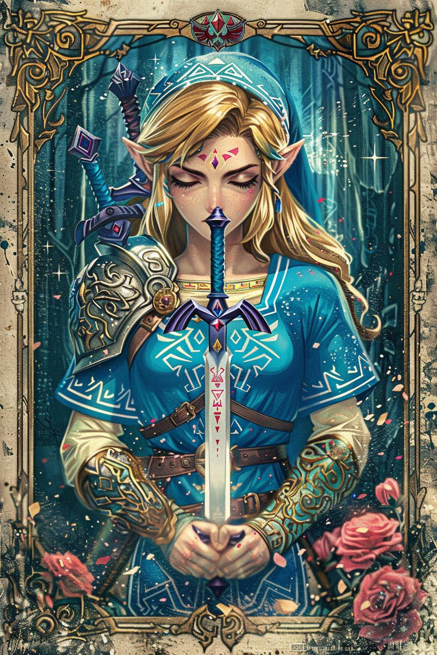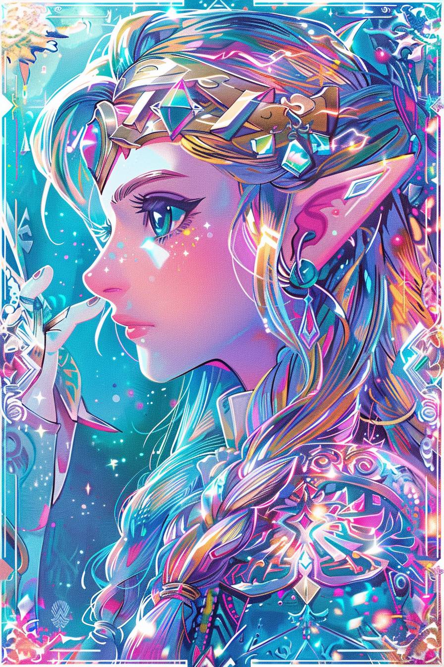 A holographic tarot card of Princess Zelda from Tears of the Kingdom