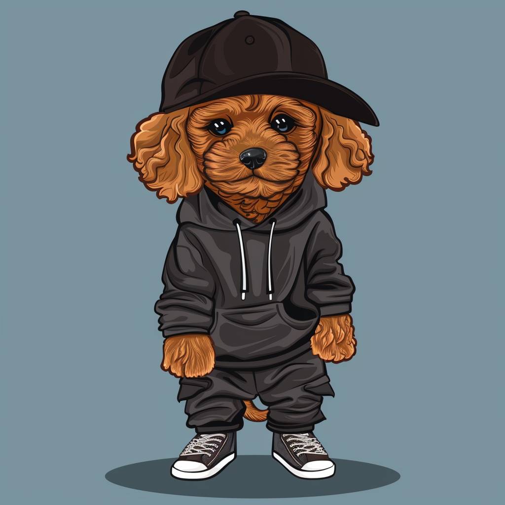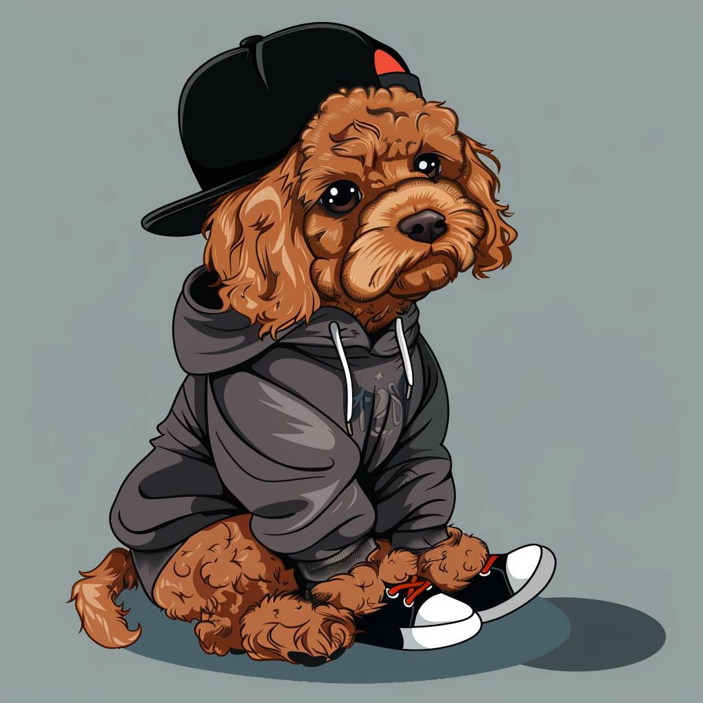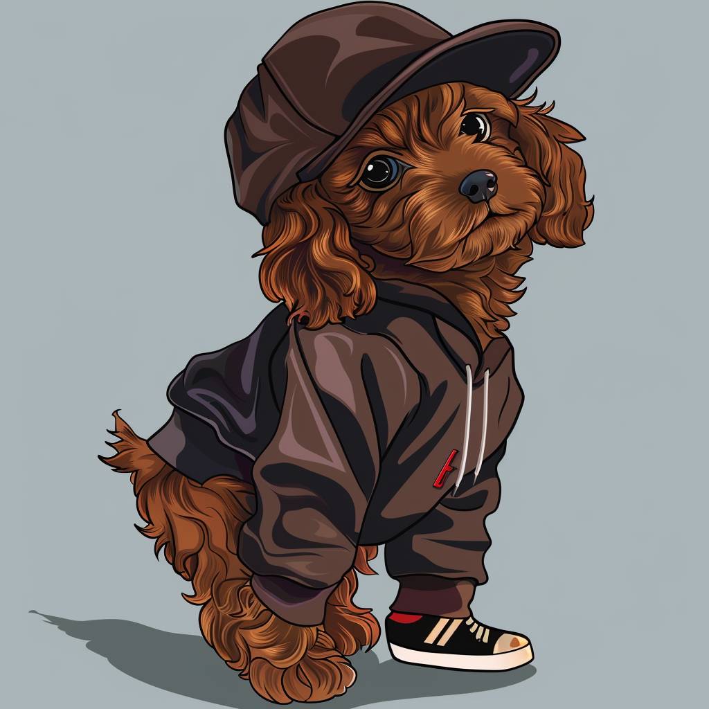 Illustration of a brown Cavoodle puppy wearing hip-hop clothing. The puppy should be dressed in a stylish hoodie, baggy pants, and a baseball cap turned sideways. The background should be simple to keep the focus on the puppy's detailed and cute appearance. --ar 1:1 --style raw --stylize 0 --v 6.0