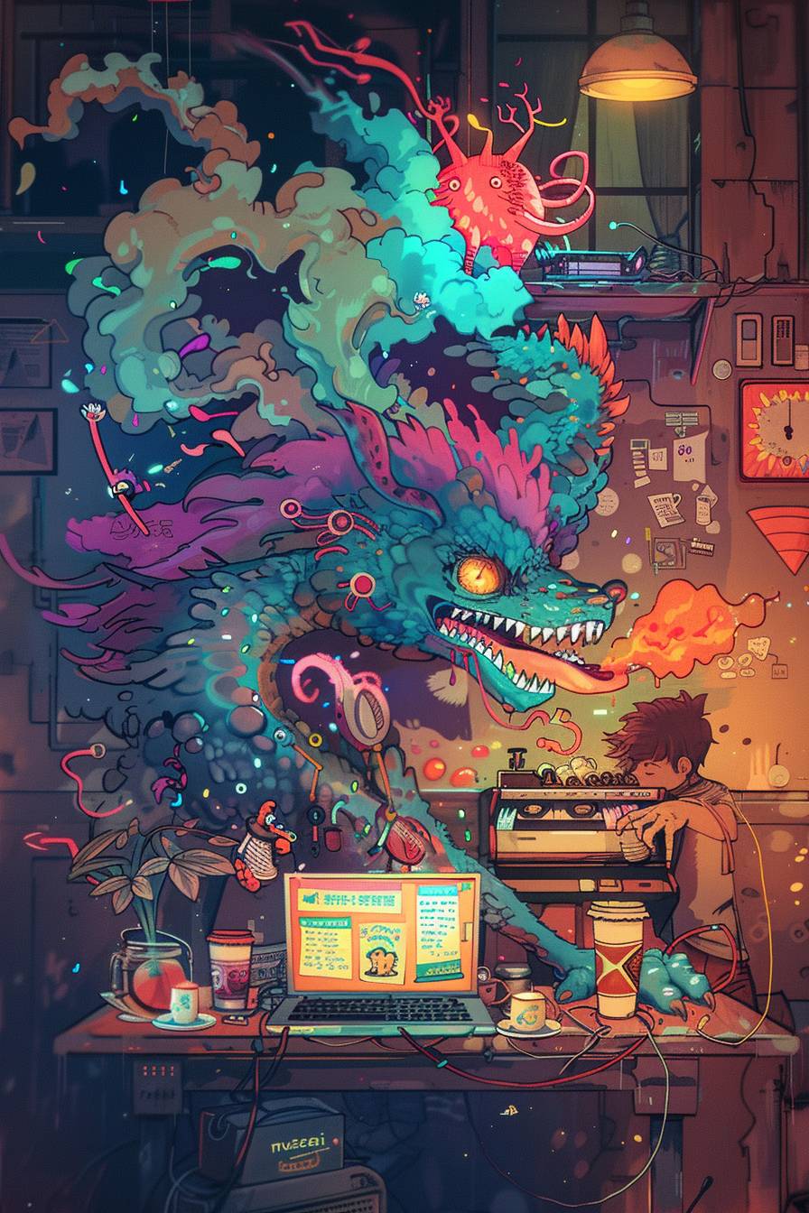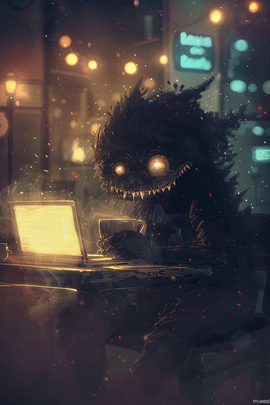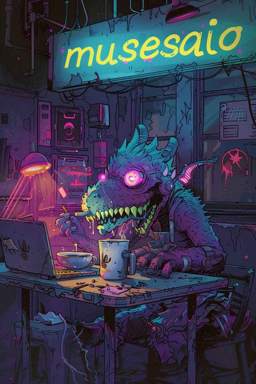 banner "#musesai.io" screaming at the gods coffee monster drinking coffee at small cafe working on a laptop --ar 2:3 --personalize hu3euo6 --v 6.0