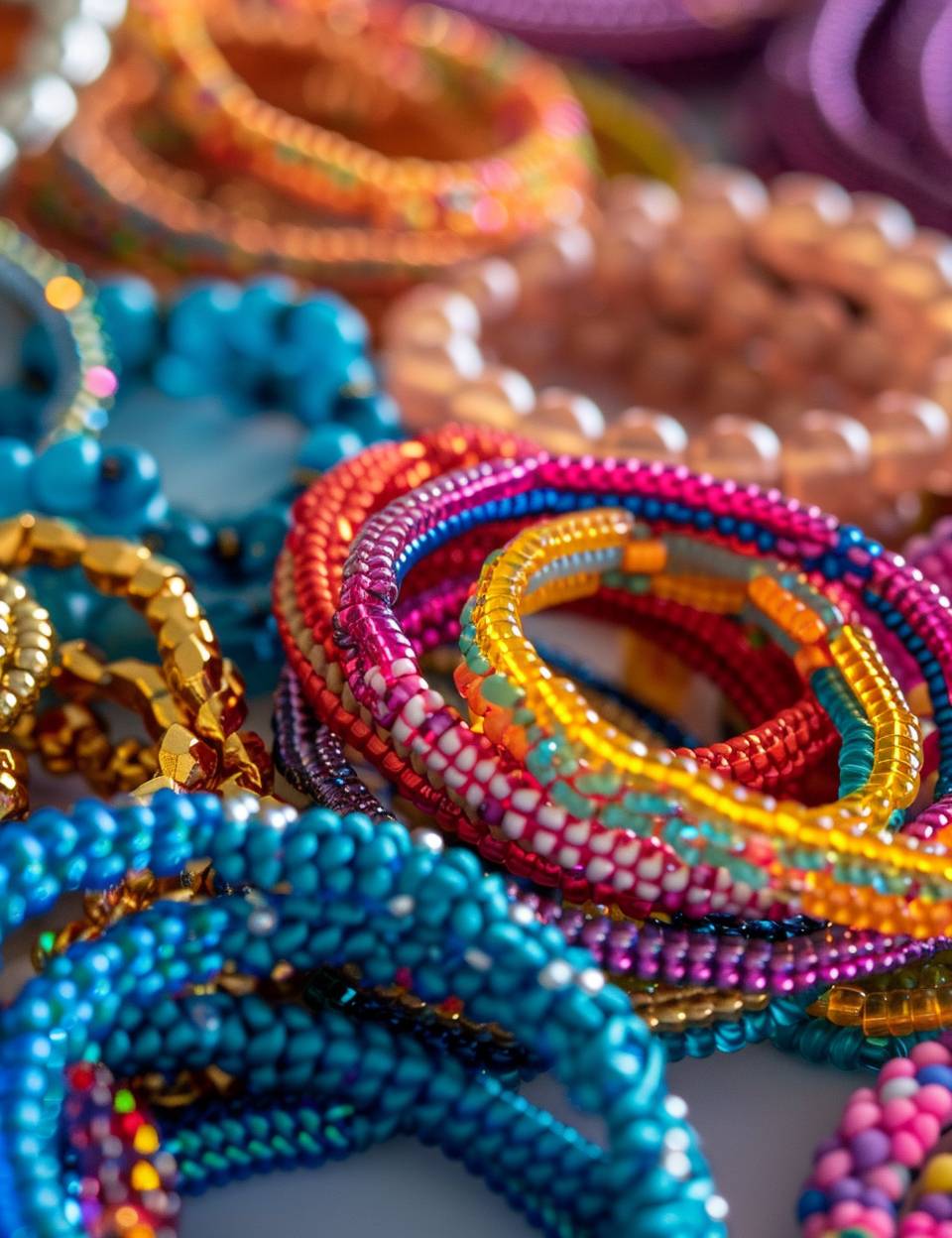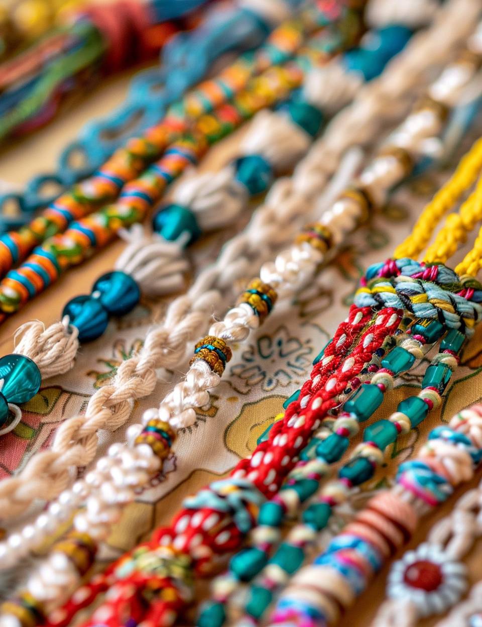 studio photograph from above of a table with beaded crochet rope bracelets. closeup. shallow depth of field --ar 17:22 --style raw --v 6.0
