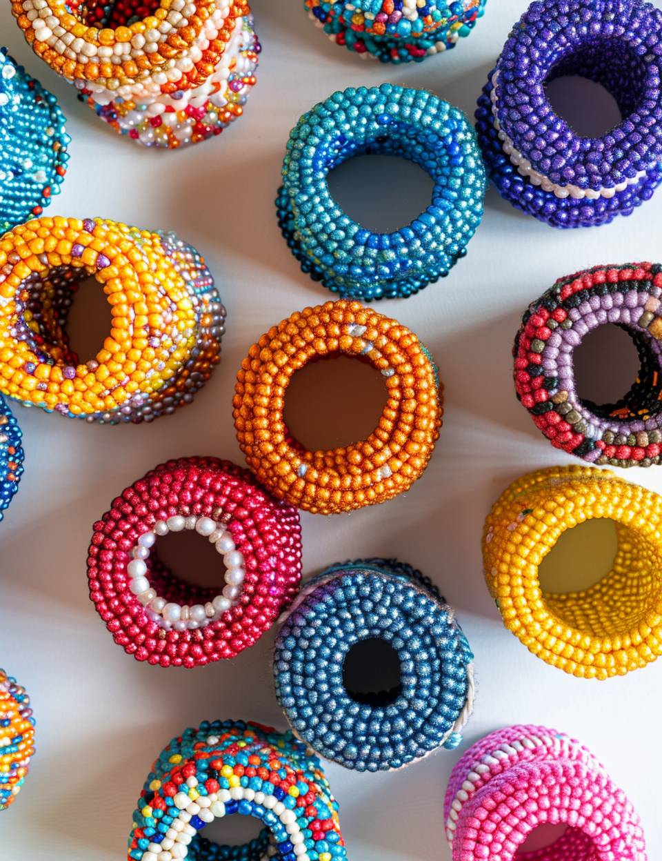 Studio photograph from above of a table with beaded crochet rope bracelets. Closeup. Shallow depth of field.