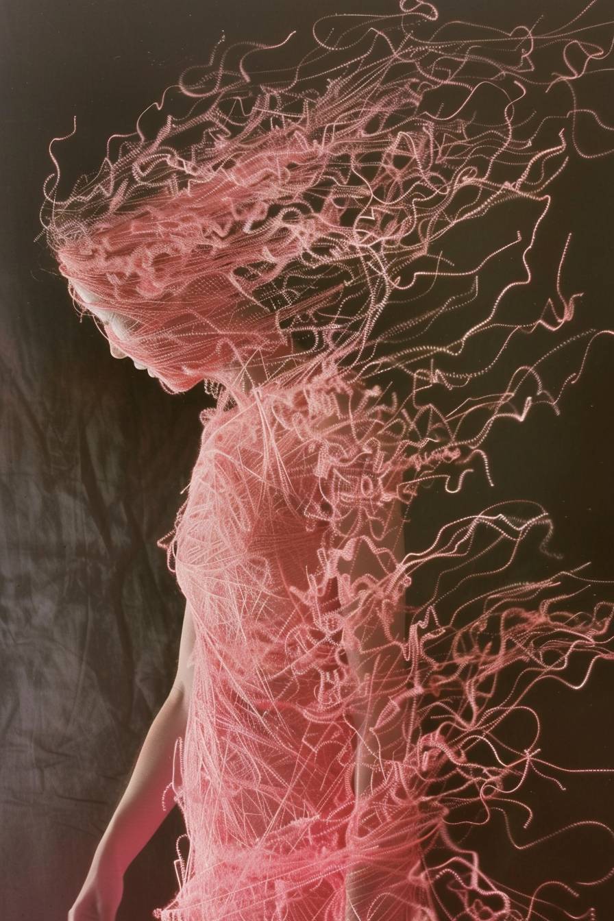 A beautiful woman, pink dress made of small string art surrealism, unraveling