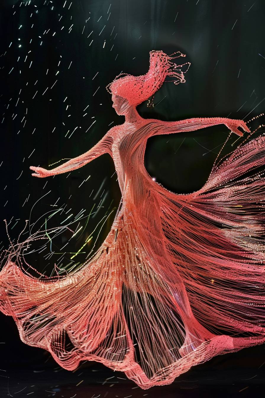 A Beautiful woman, pink dress made of small string art surrealism, unraveling --ar 2:3 --v 6.0