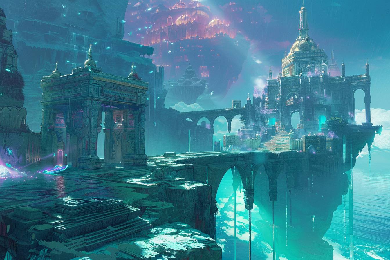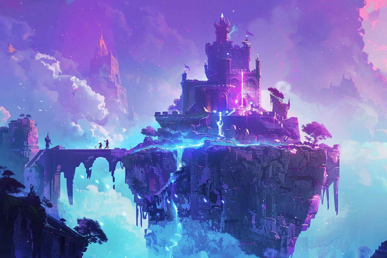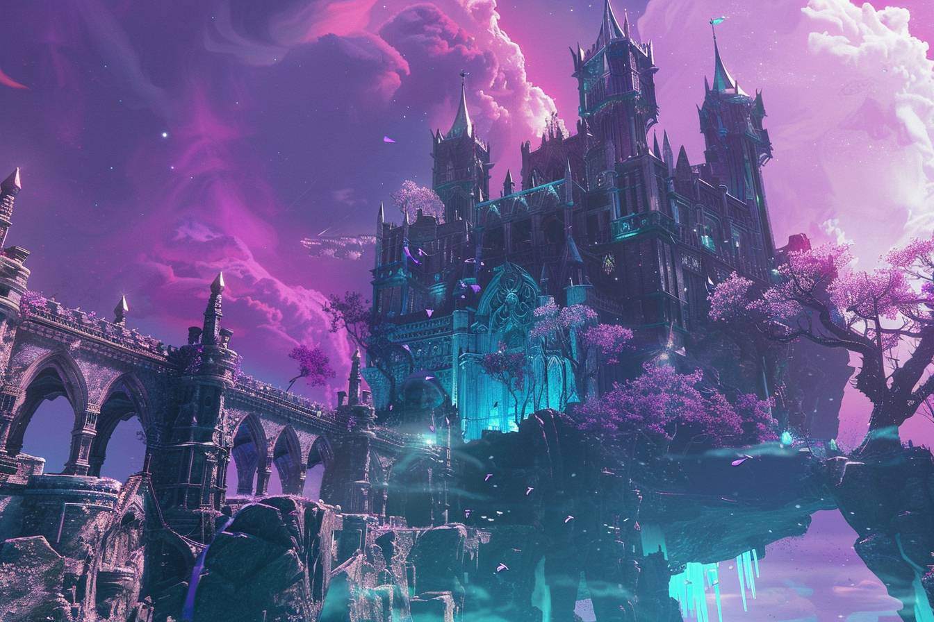 Embark on an adventure through an ancient floating castle in High Fantasy Kingdoms, where the royal violet melds with the mystical teal, creating a scene of epic tales and legendary quests.