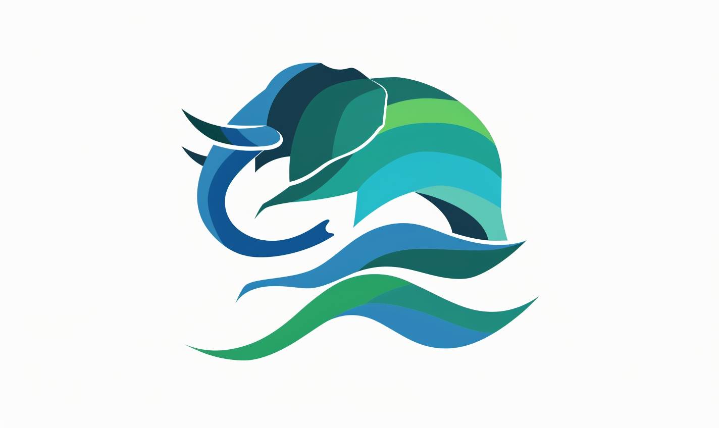 A logo consisting of abstract shaped style, blue and green wave elements with an elephant trunk, simple and minimal, in the style of Rob Janoff, with a white background color, vector art design for a web app logo.