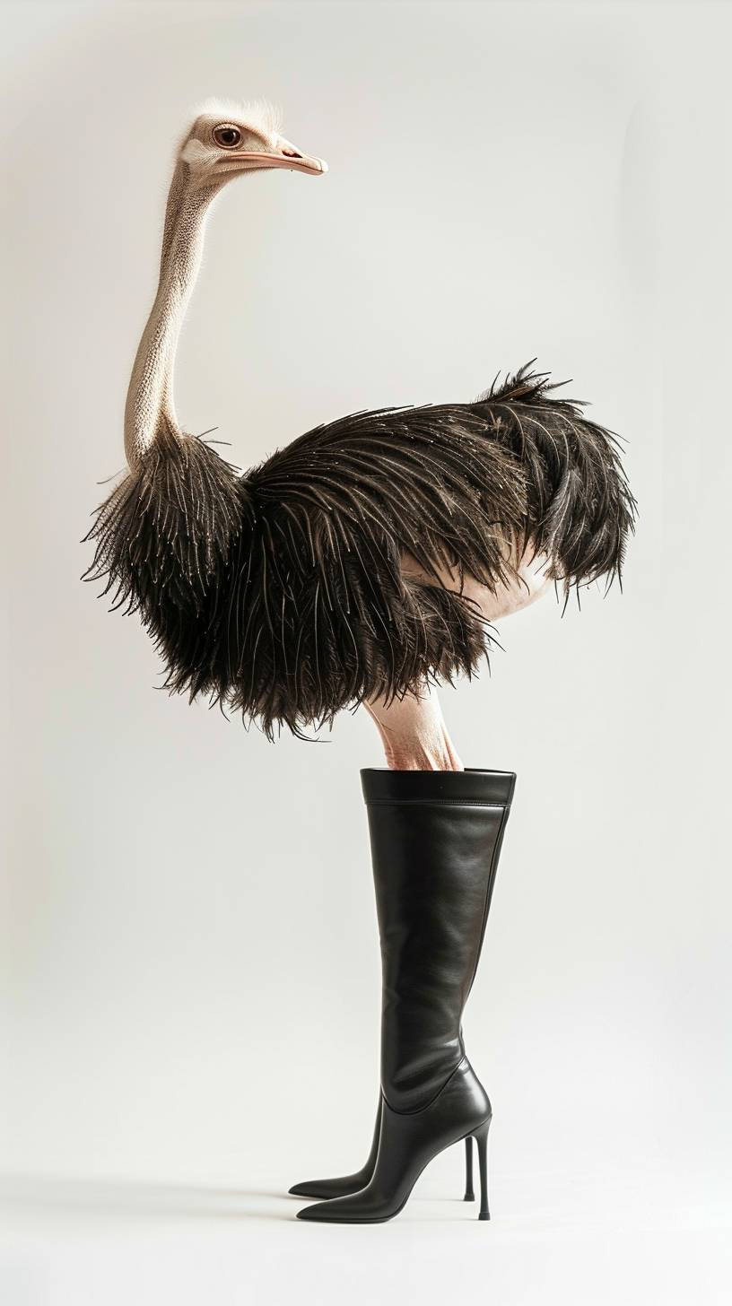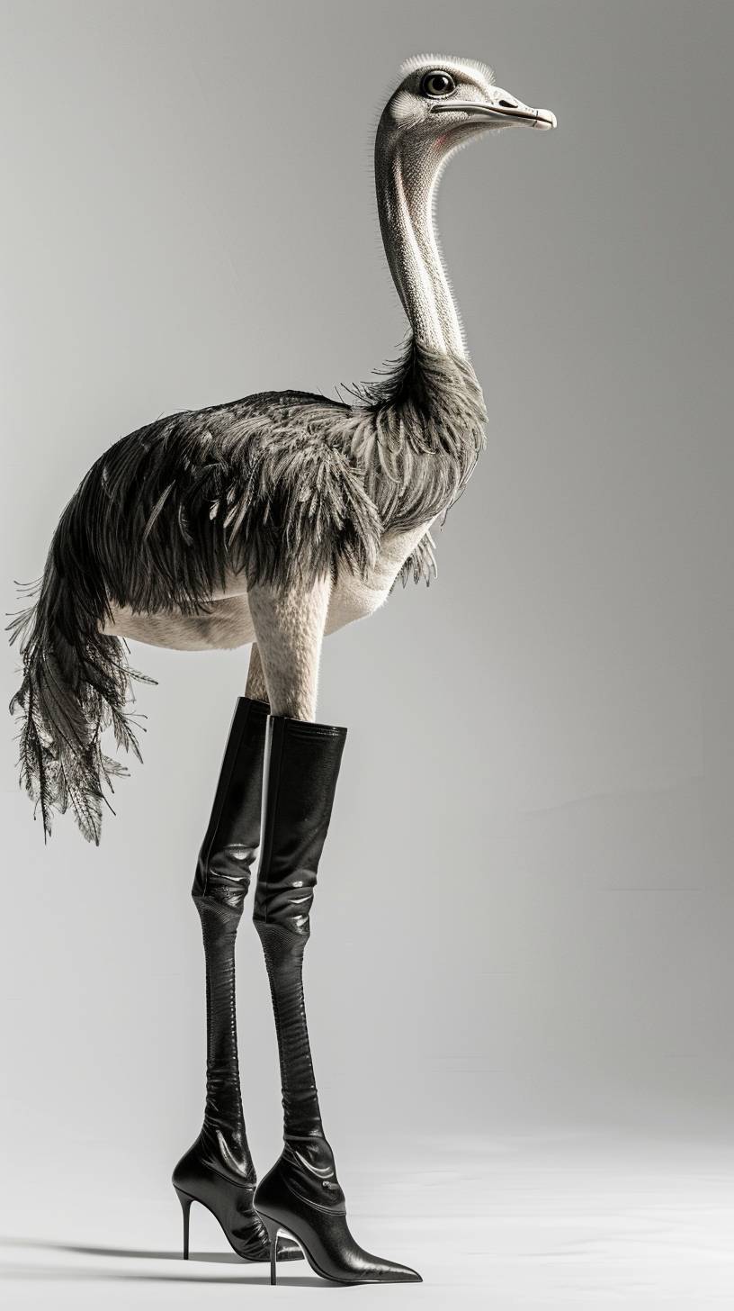 surreal photo of a beautiful ostrich wearing over knee leather boots with high heels on both feet. the ostrich is viewed from the side. the ostrich has over-knee leather boots on both legs. minimalistic white studio background. hyper-realistic. cinematic. studio lights. --ar 9:16 --style raw --v 6.0