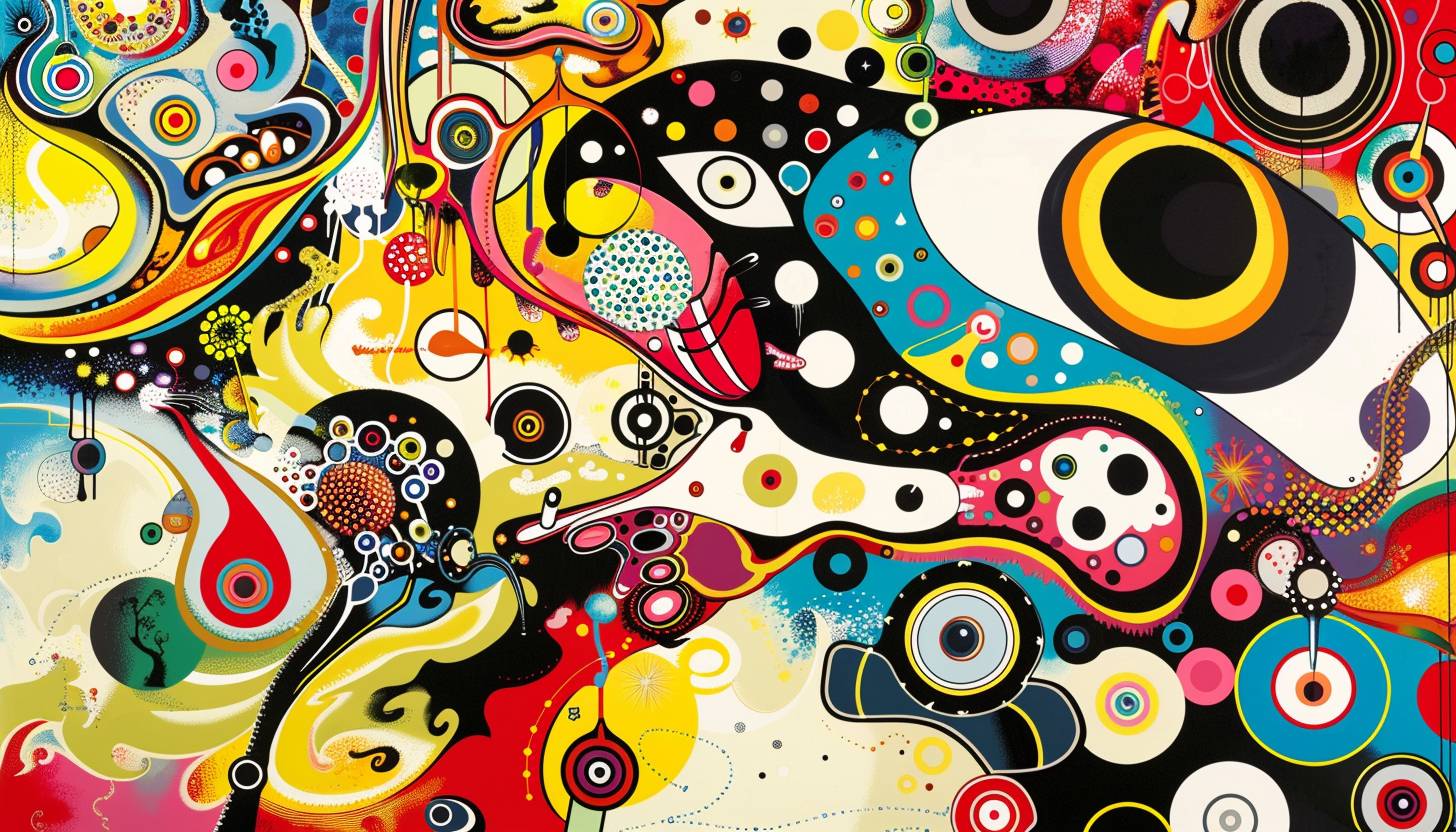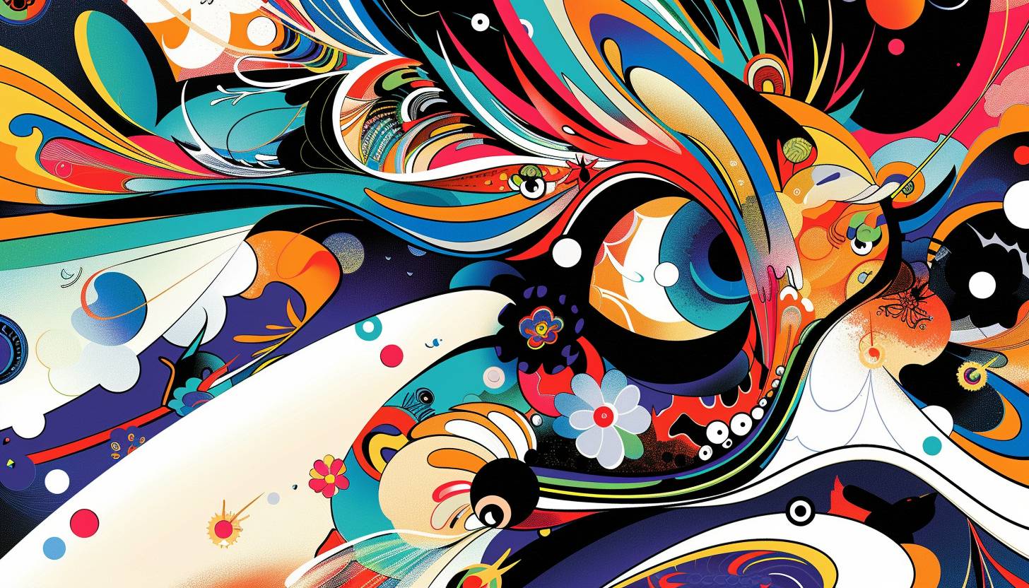 a [Subject] in The style of Takashi Murakami, vibrant colors, whimsical elements, bold and clean lines, dynamic textures, 2D, illustration --ar 7:4 --v 6.0