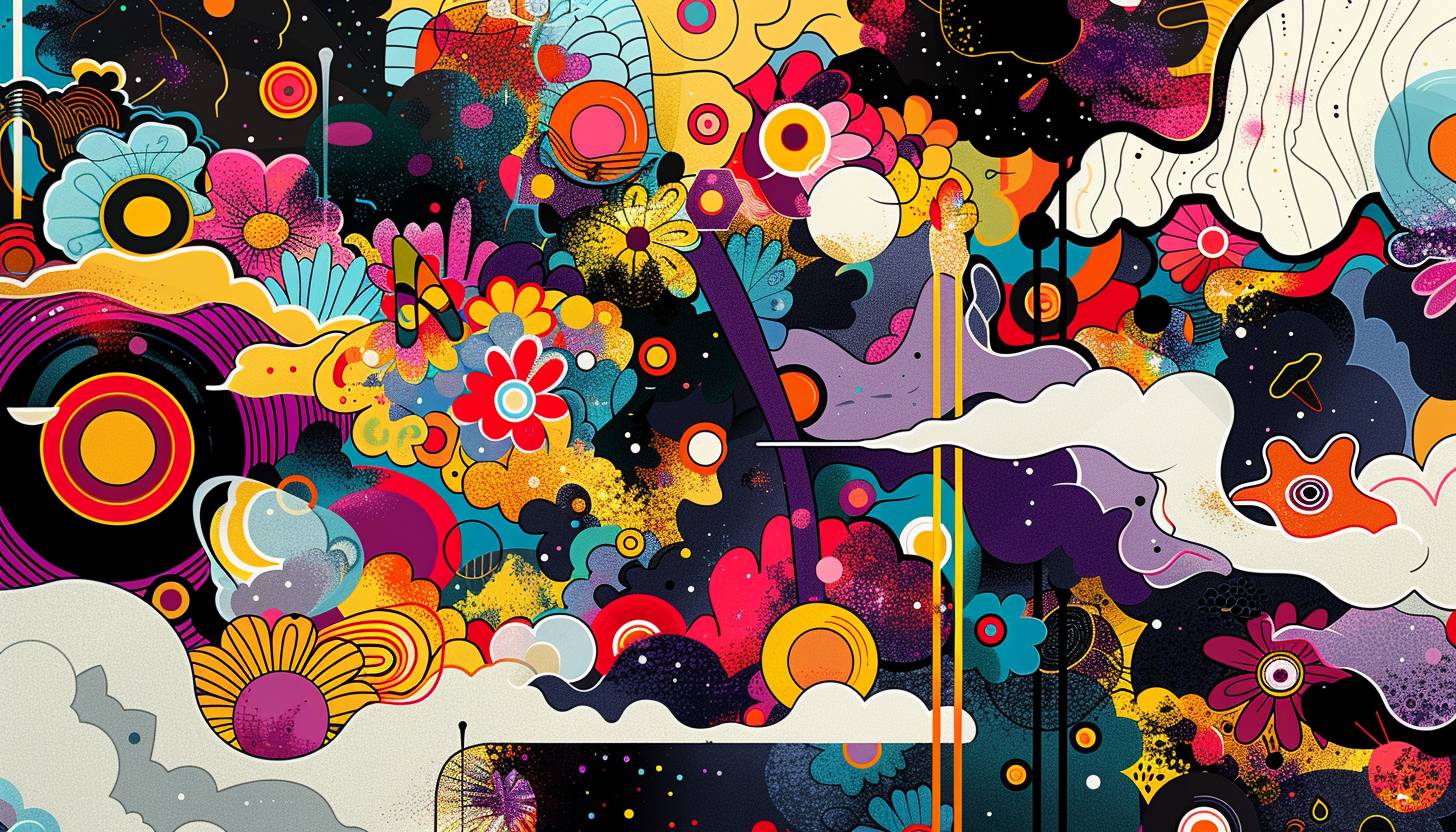 Illustration in the style of Takashi Murakami, vibrant colors and whimsical elements