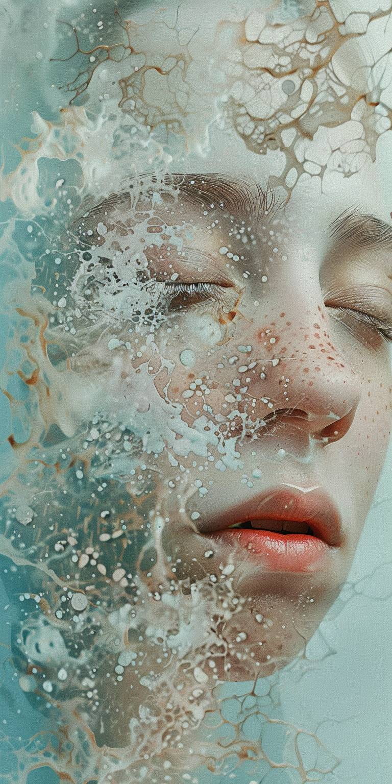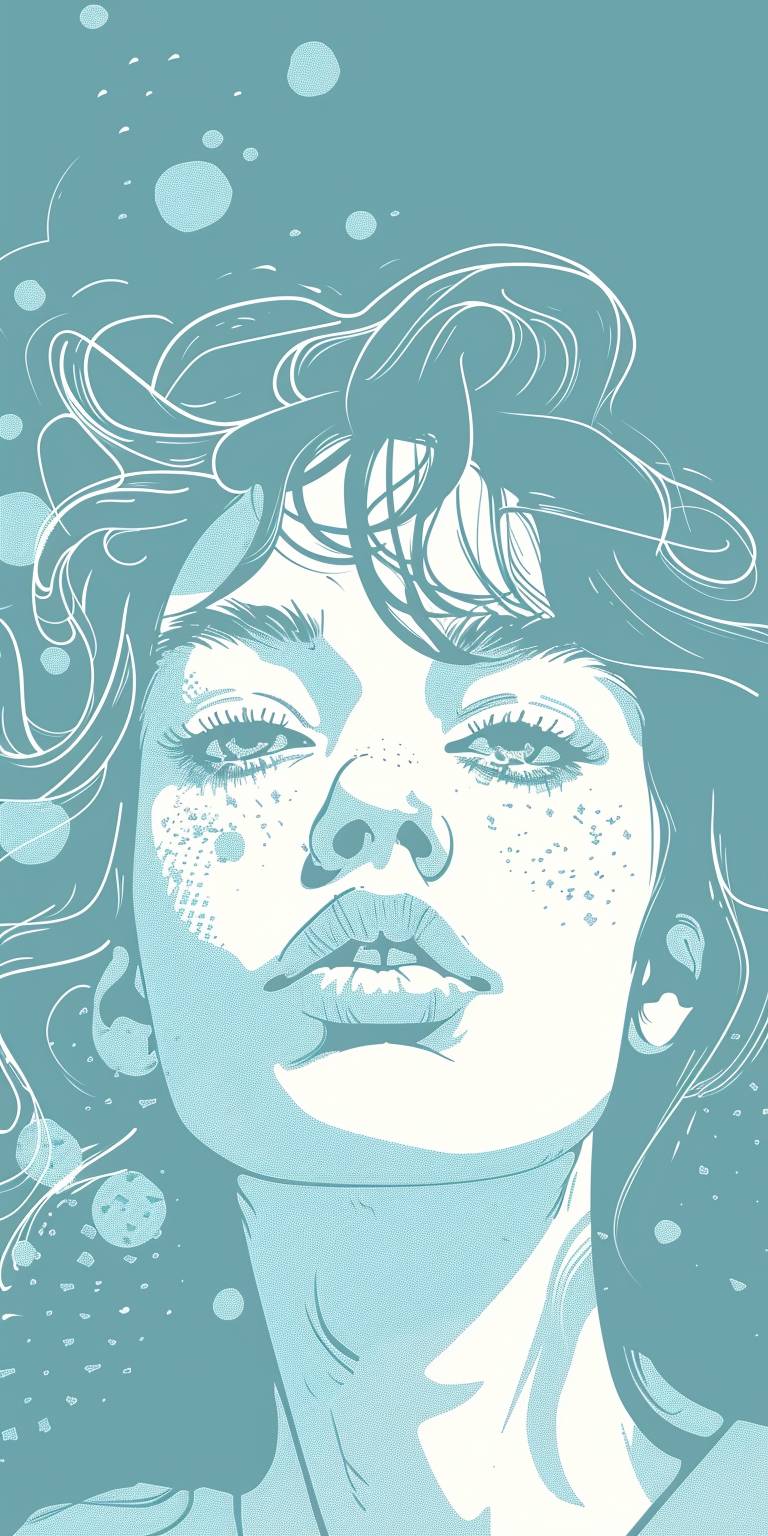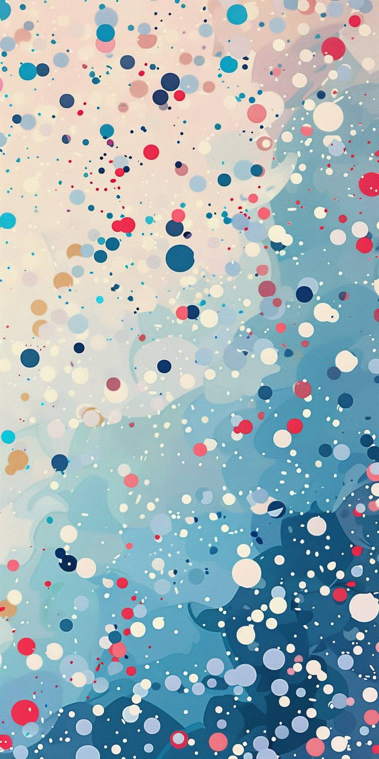 Vary the image in the style of Hülya Özdemir, light blue background with small irregular white dots.