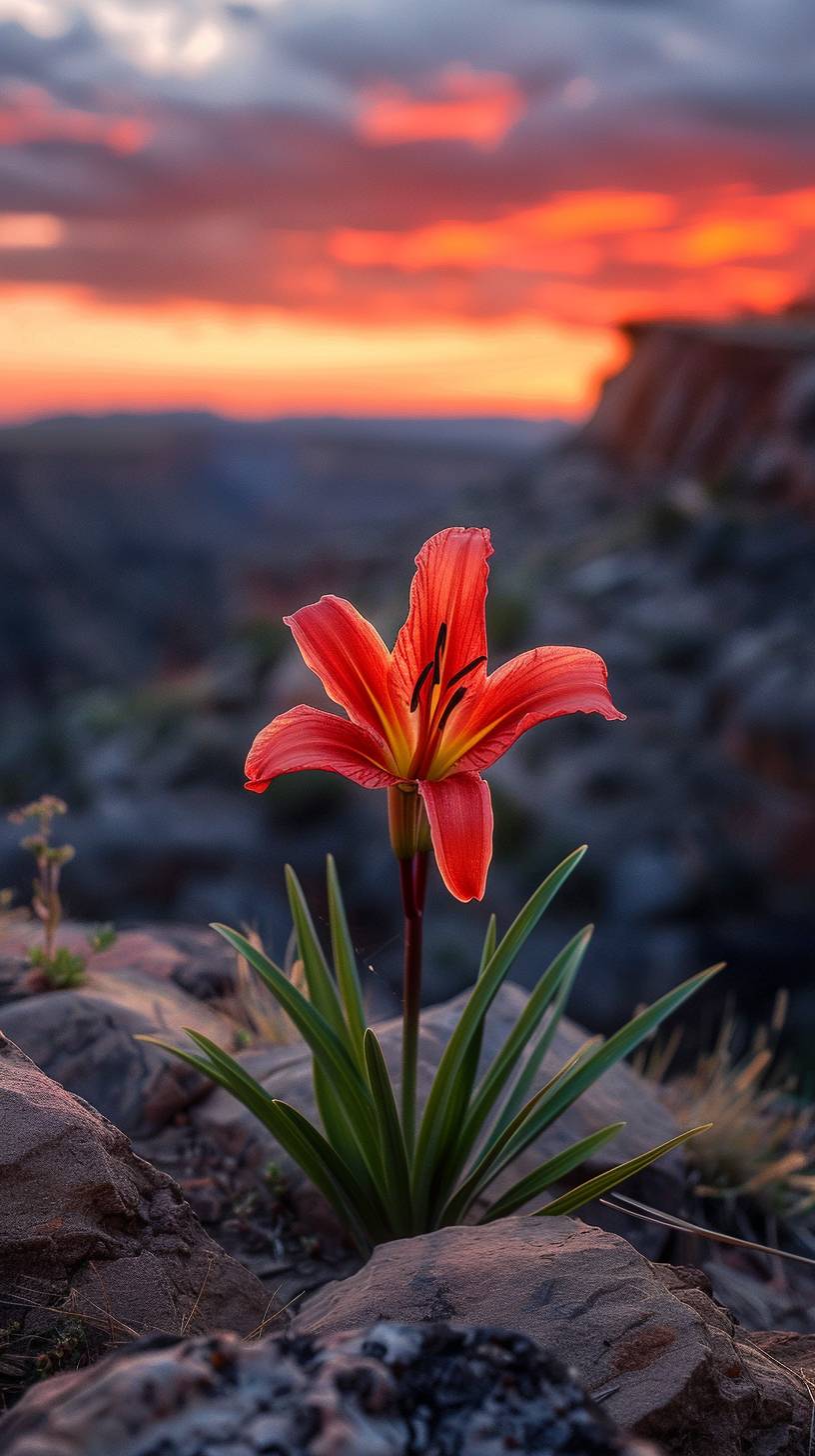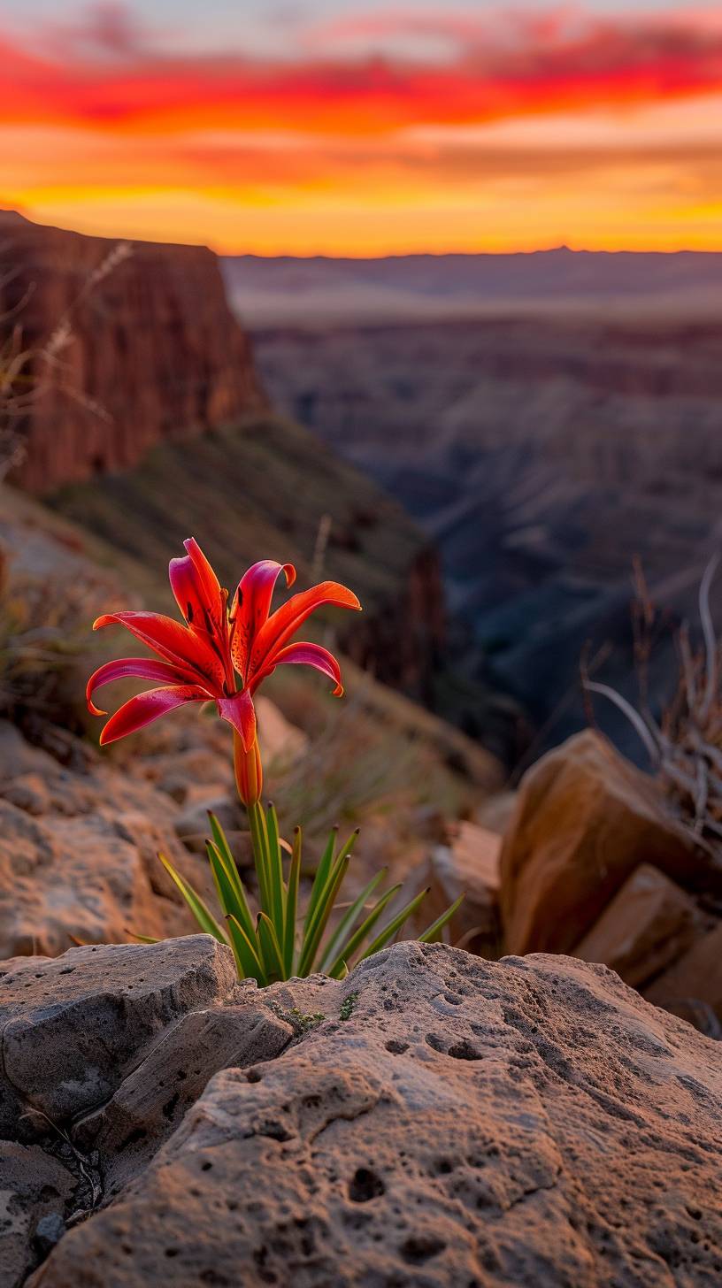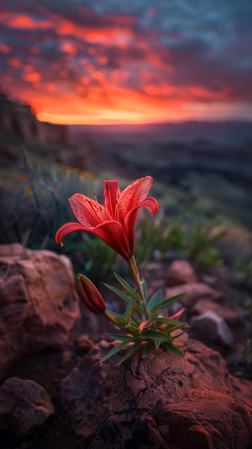 A red lily blooms at sunset on the canyon edge, a stunning scene.