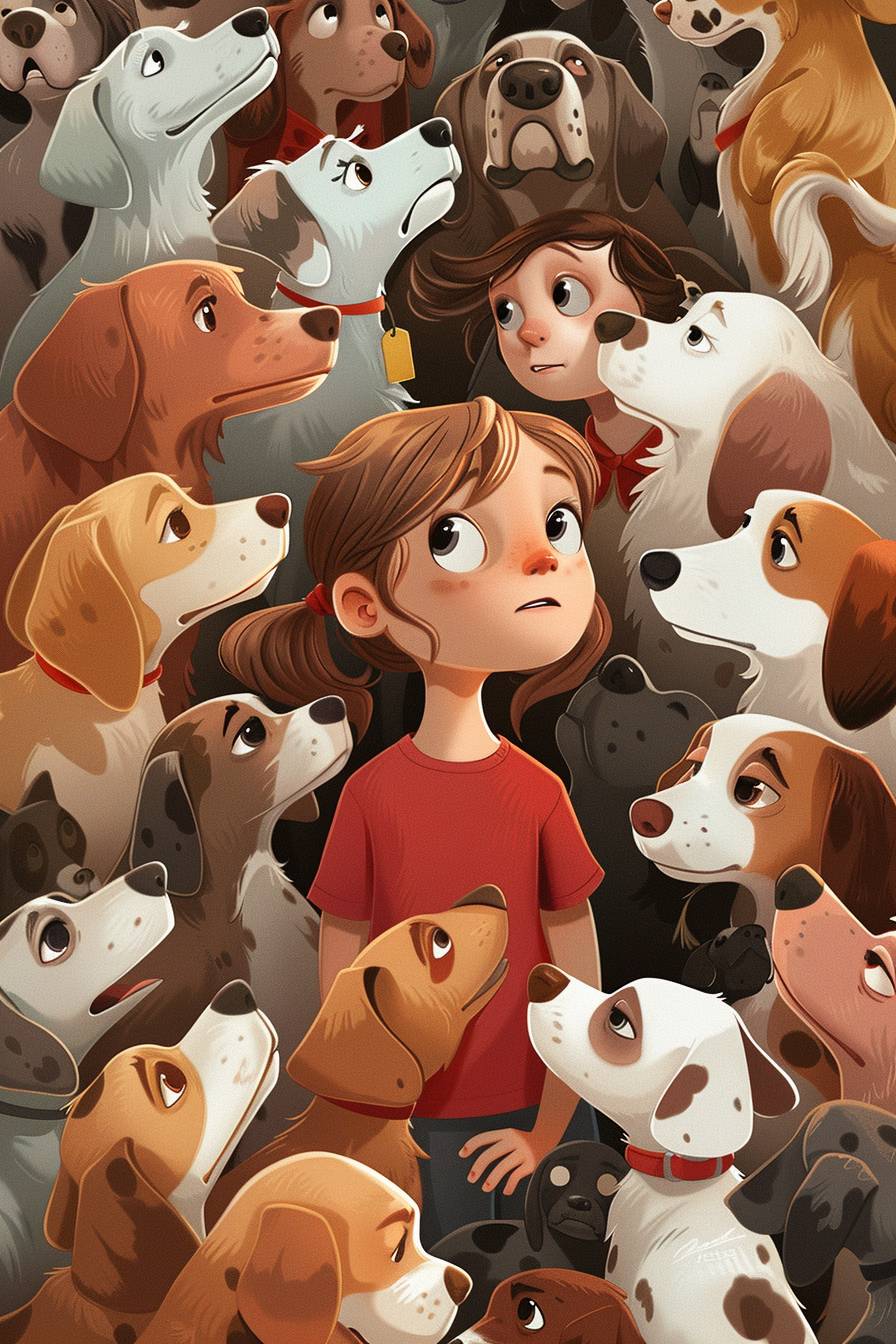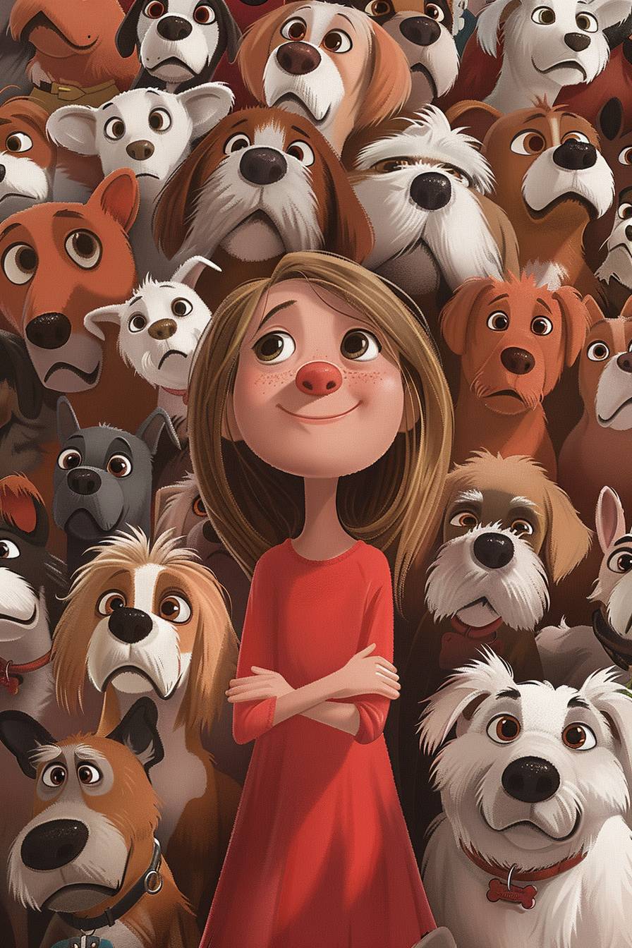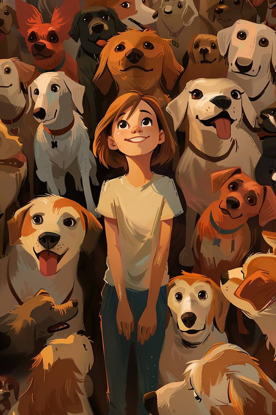 a simplistic pixar style portrait of a young 9-year old Caucasian girl with Sandy blond ish brown hair standing surrounded by lots and lots of dogs of all different breeds, shapes and sizes, in a pixar cutesy style --ar 2:3 --v 6.0