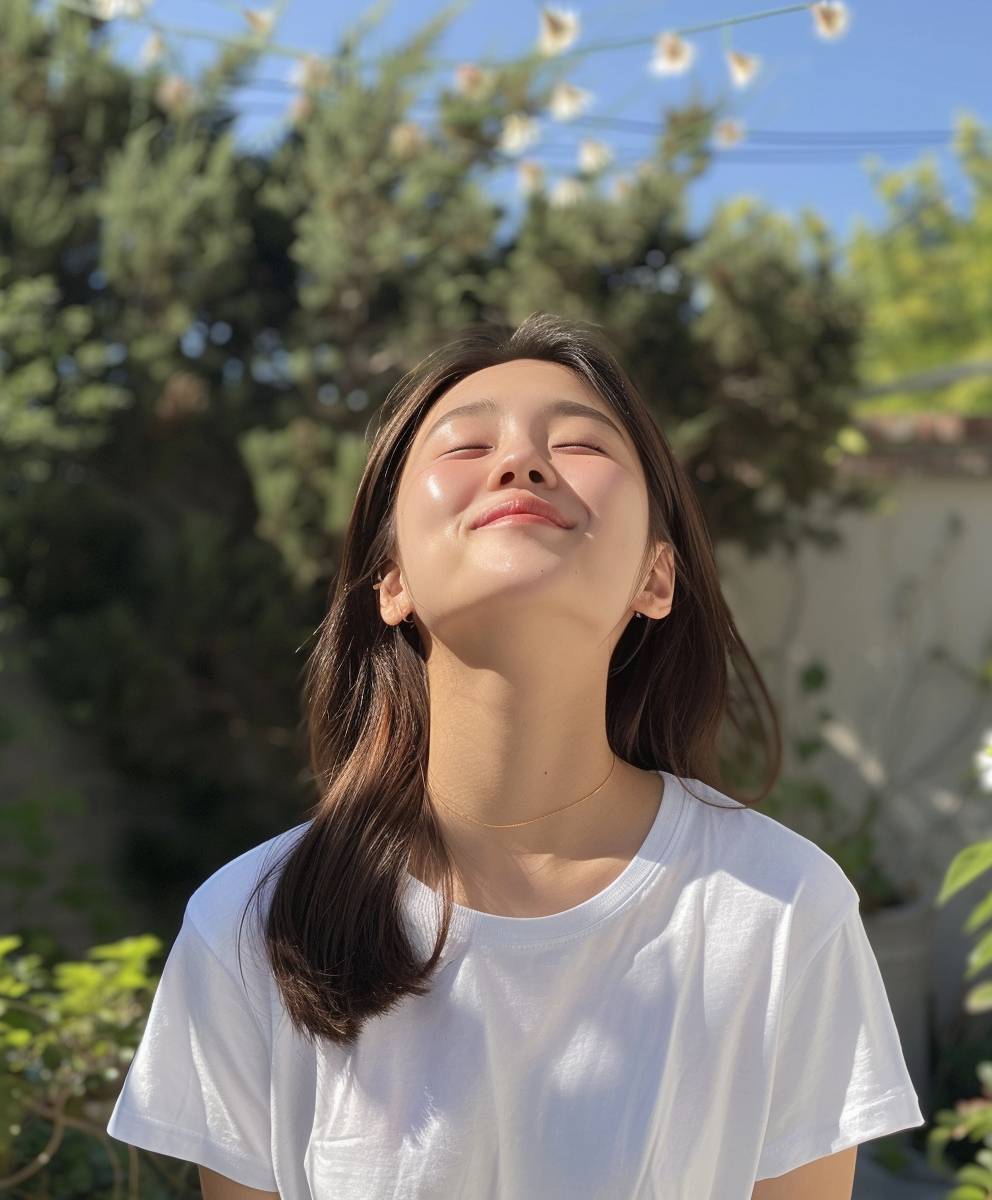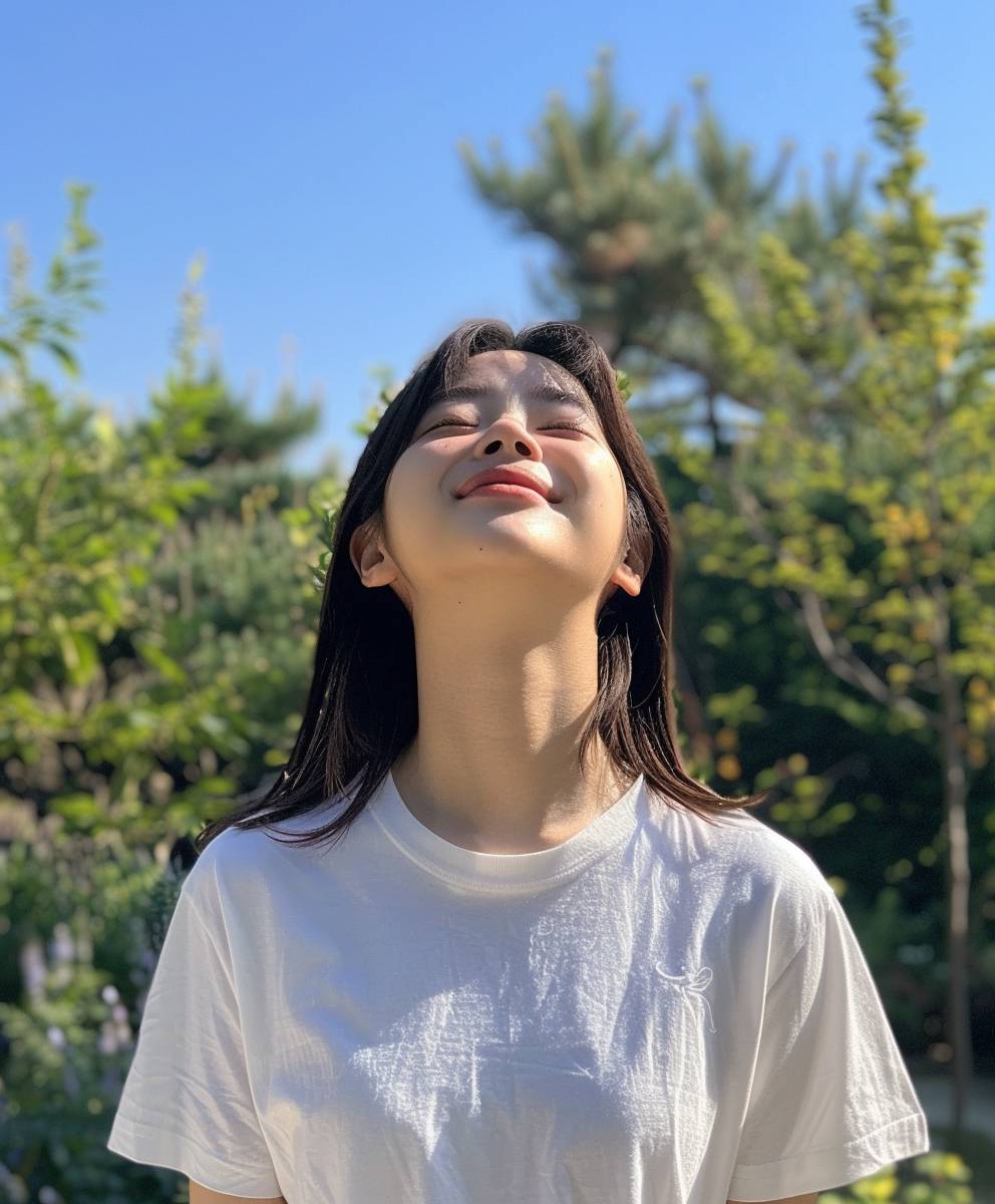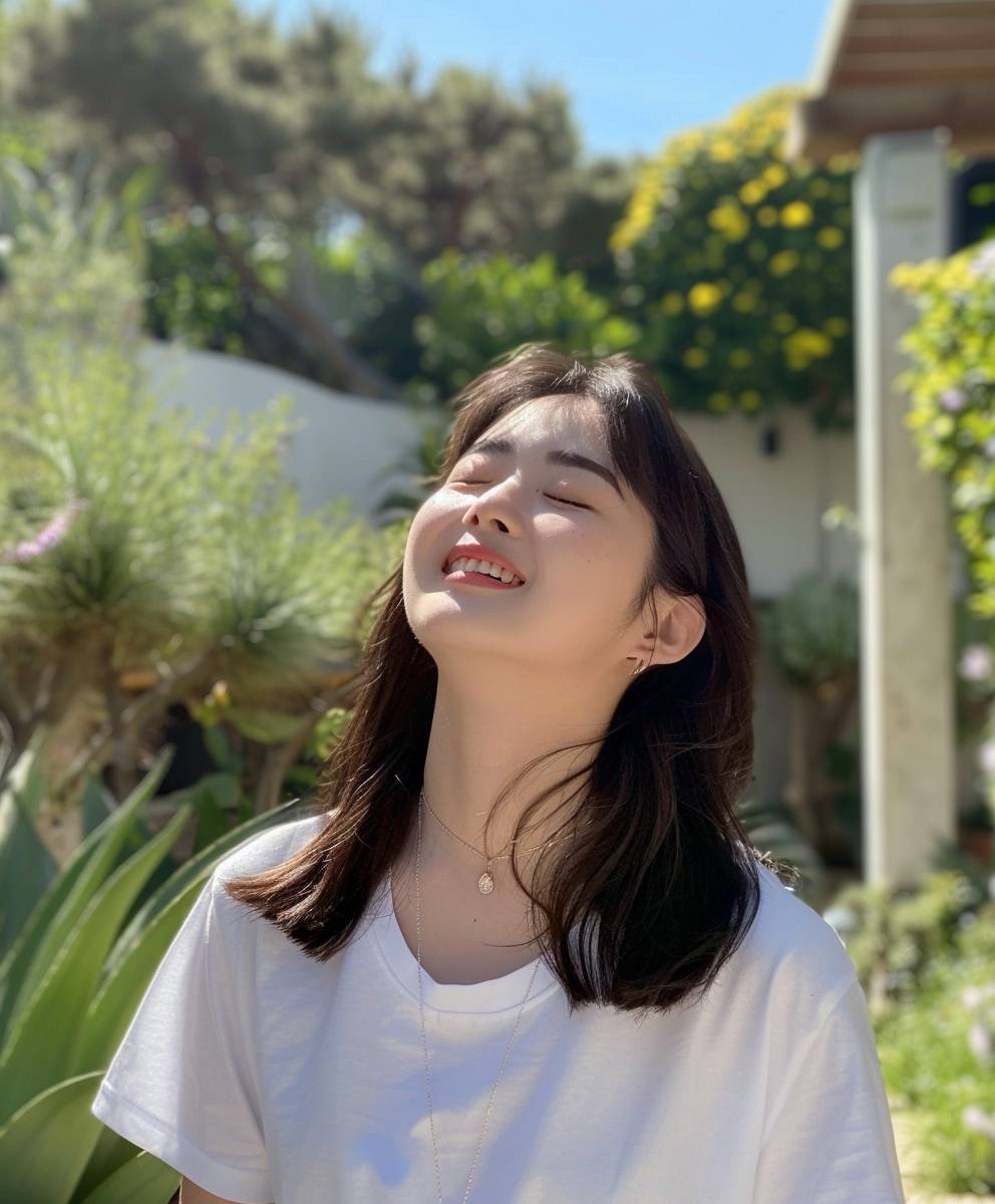 Korean girl, smiling and looking up at the sky with her eyes closed in an outdoor garden setting, white t-shirt, neck pain expression, daylight, posted on TikTok video from phone camera --ar 53:64 --v 6.0