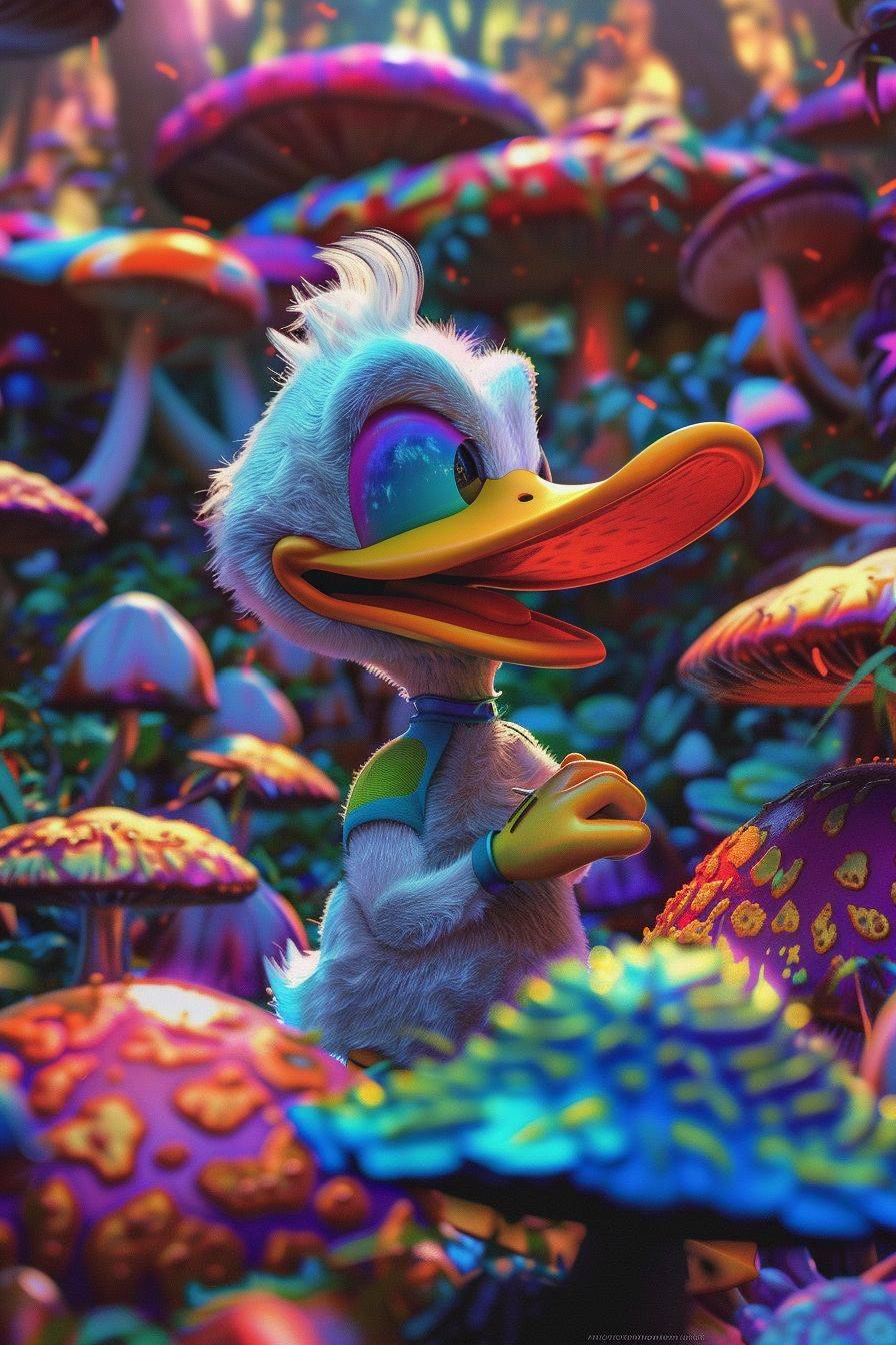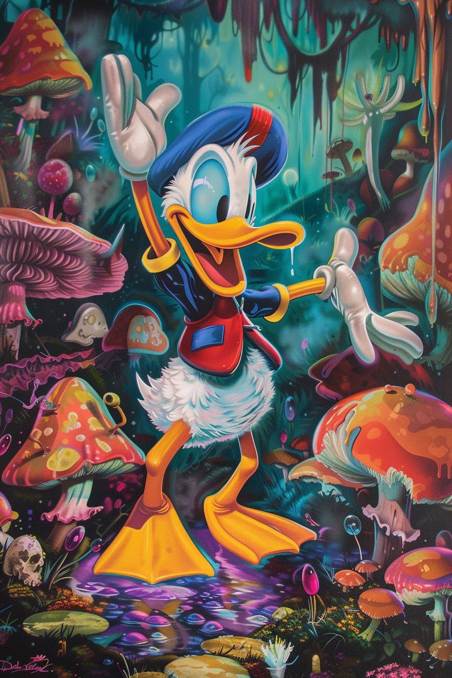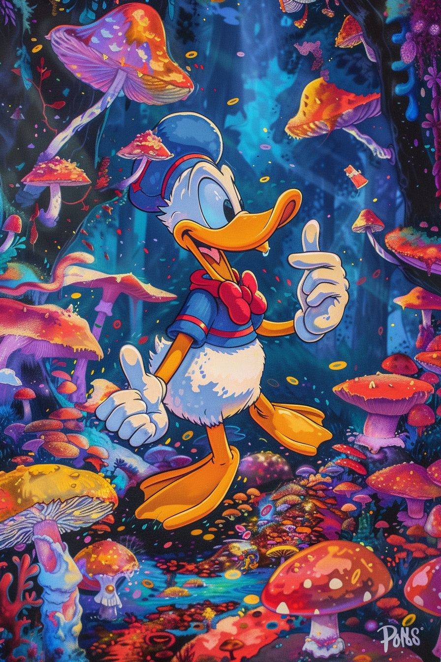 Donald Duck is super happy and ecstatic in a trippy colorful mushroom forest.