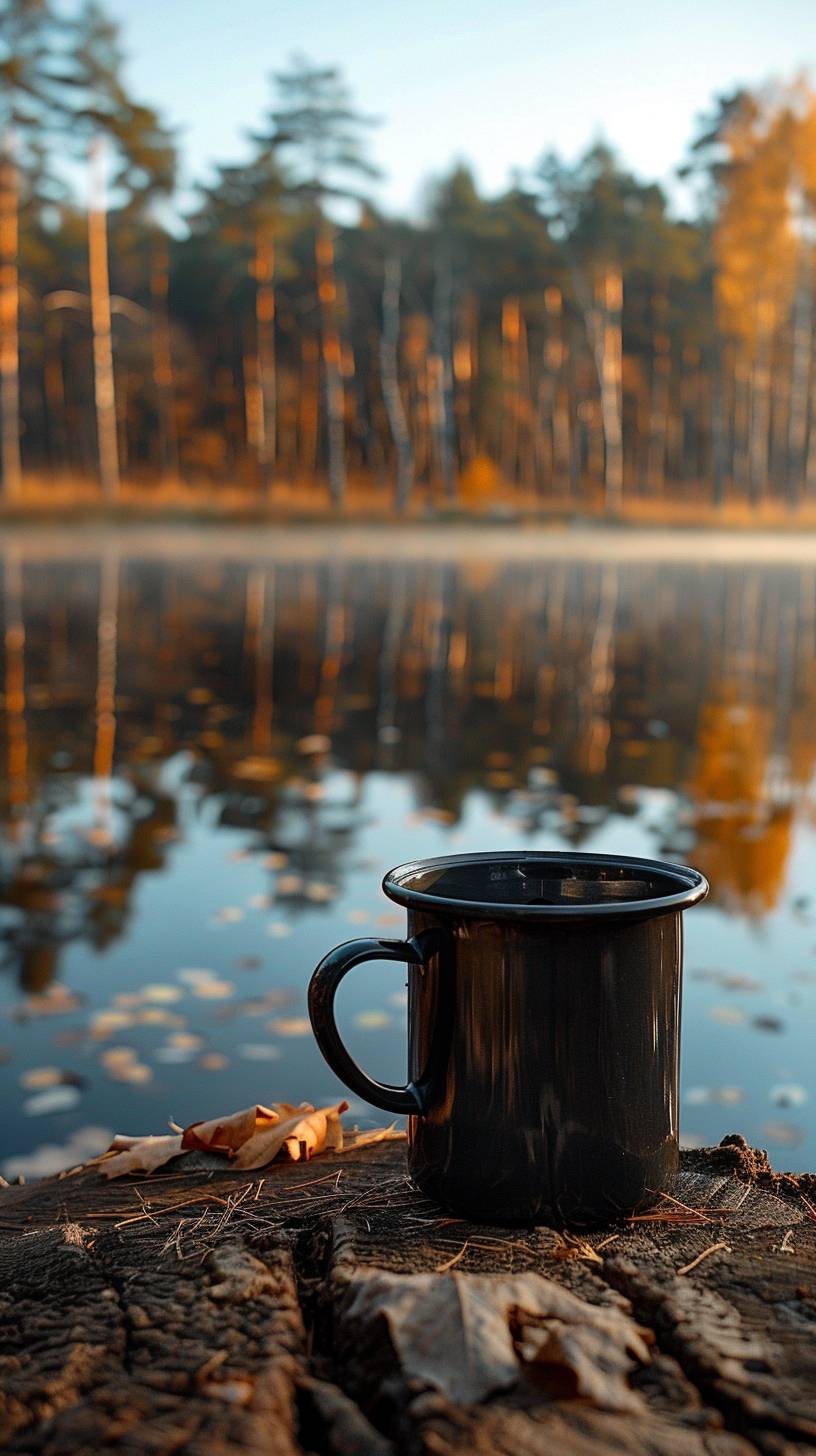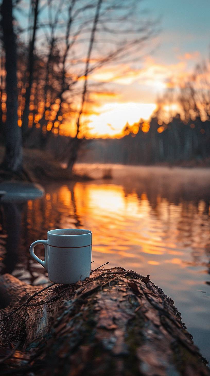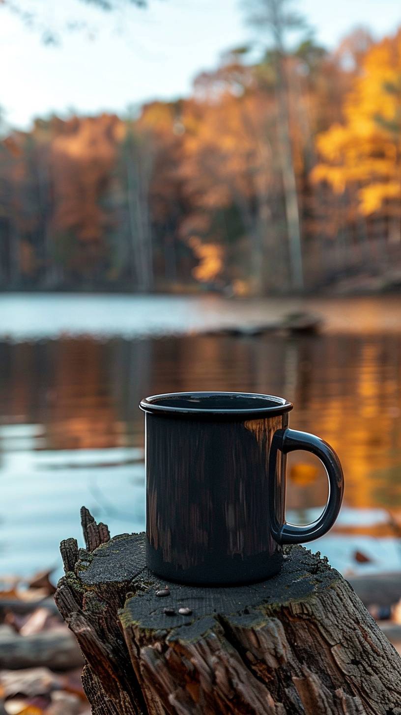 Morning coffee mug on a cut tree with background trees and water reflection.