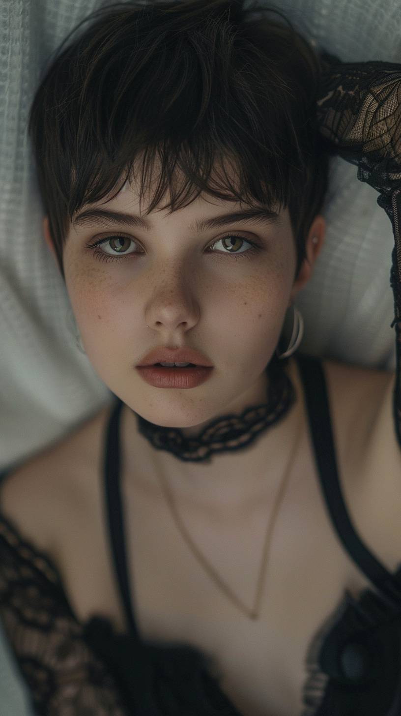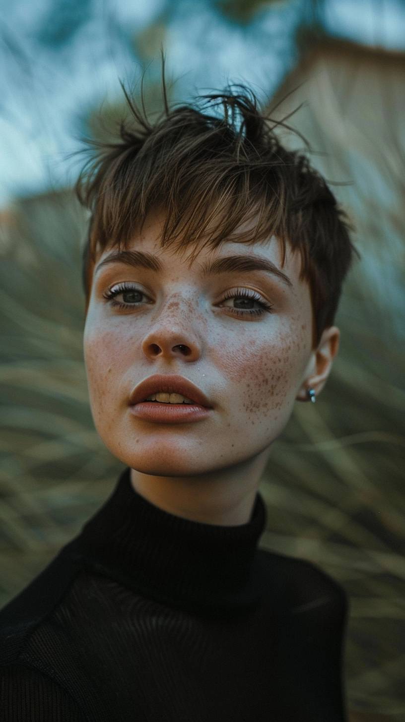 All angles view, pixie cut, fashion, vogue, eyes looking meaningful, aesthetic photo taken by a Sony A9, 8K Quality