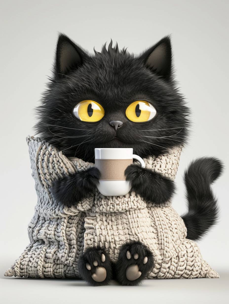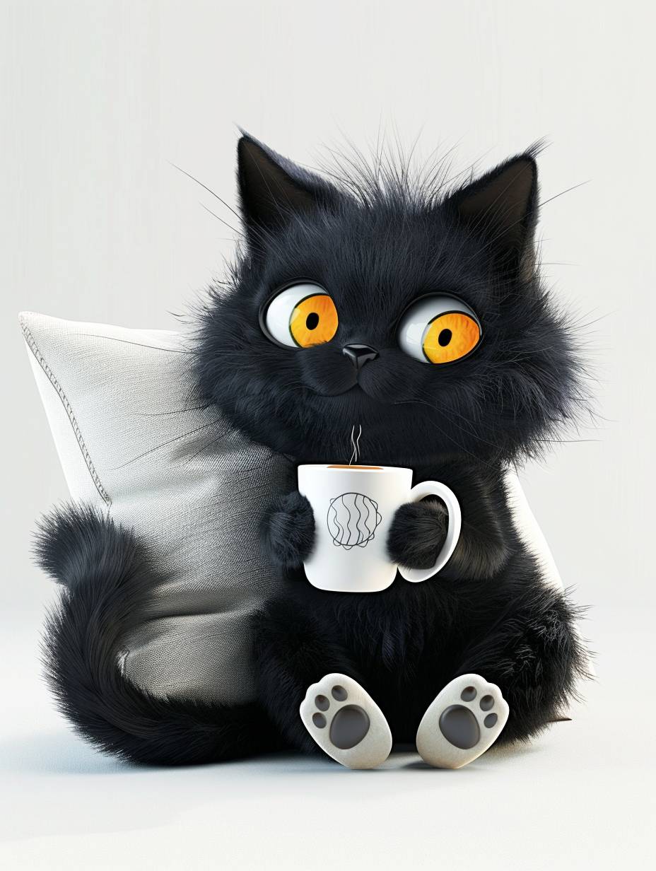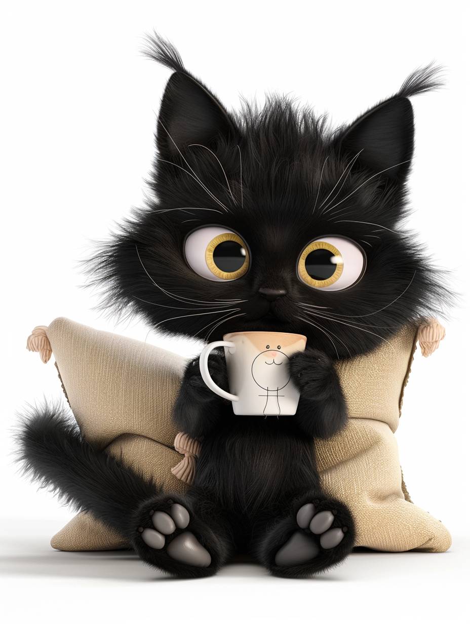 Cute black cat sitting with his back against a throw pillow drinking coffee, cartoon character design and high resolution 3D rendering, cute with adorable expression, white paws holding a cup of coffee, yellow eyes, fluffy, black tail --ar 3:4 --v 6.0