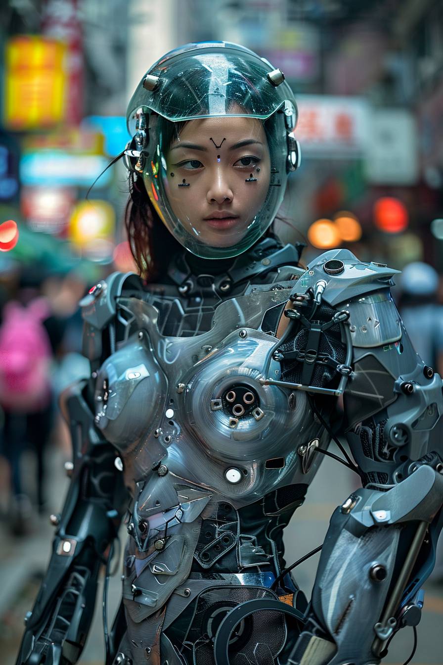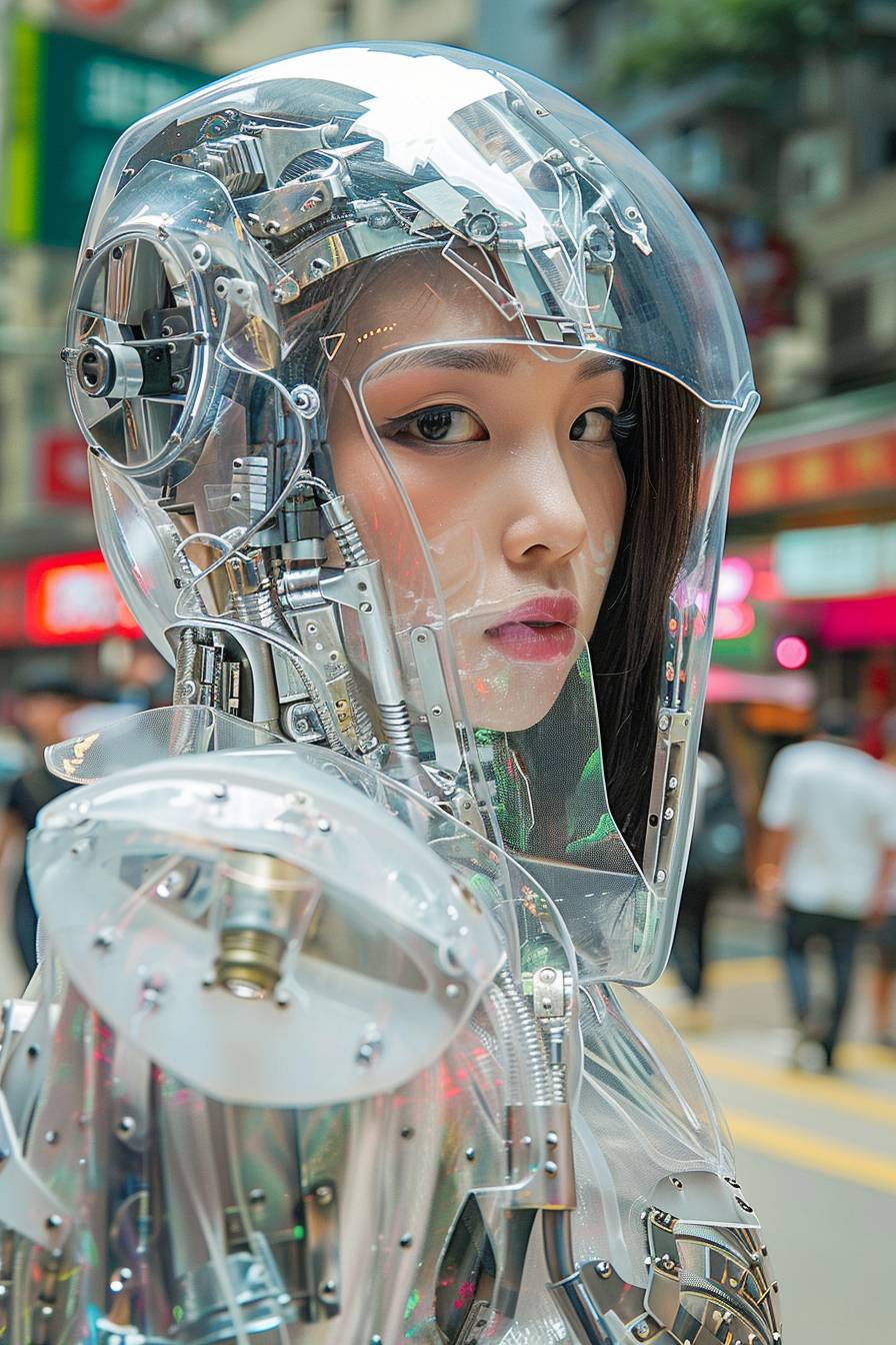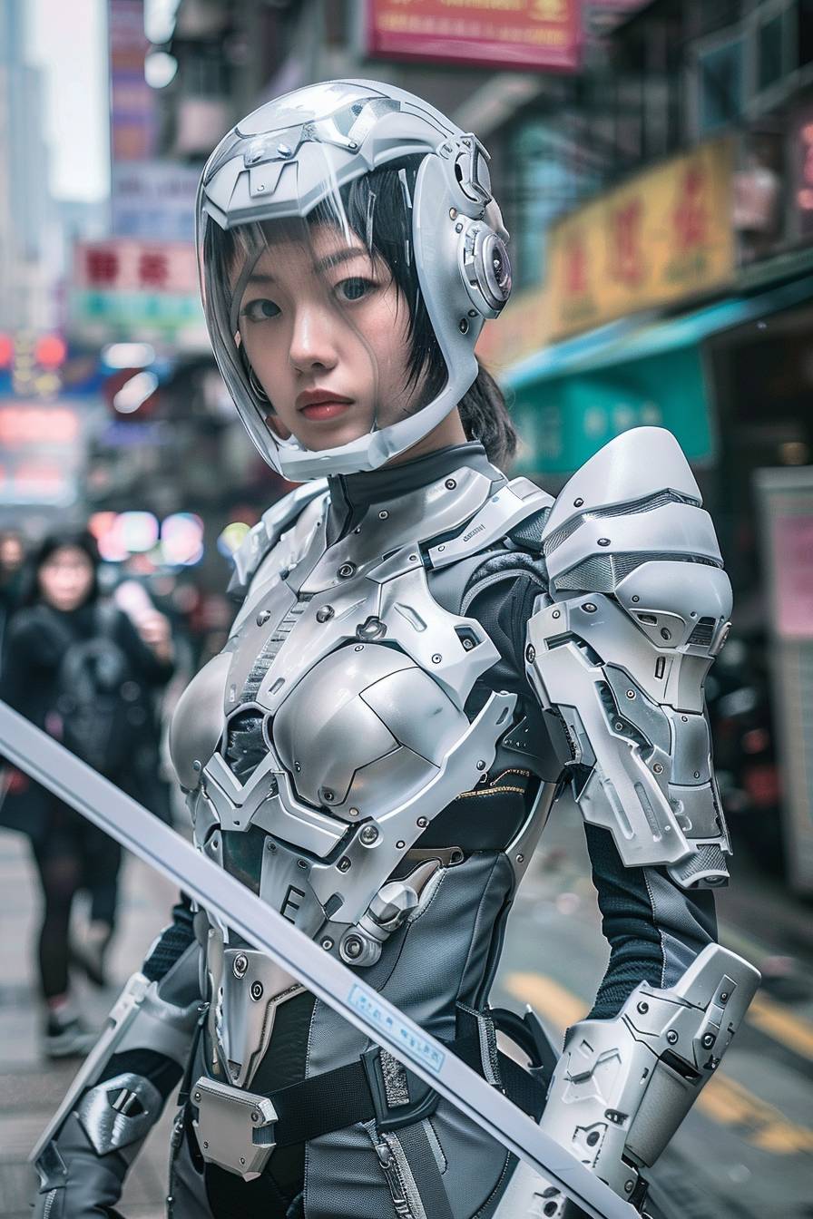A beautiful cyborg-hime wearing a clear glass helmet, she stood on the streets of Hong Kong in a light textured costume of mechanical steel, sword in hand, with sad eyes --ar 2:3 --v 6.0
