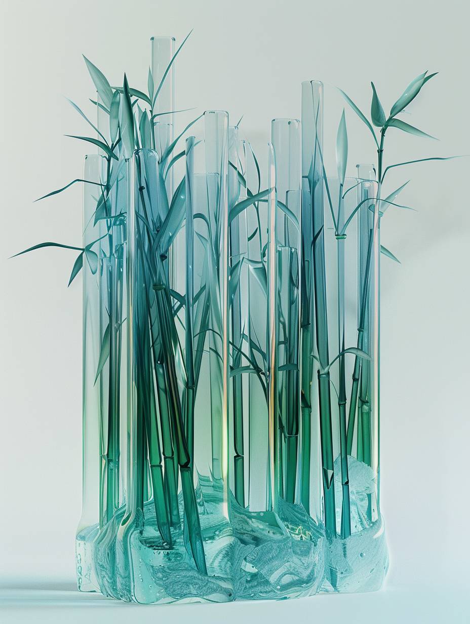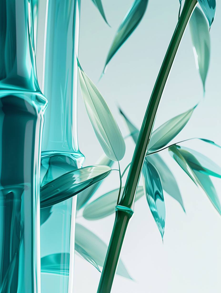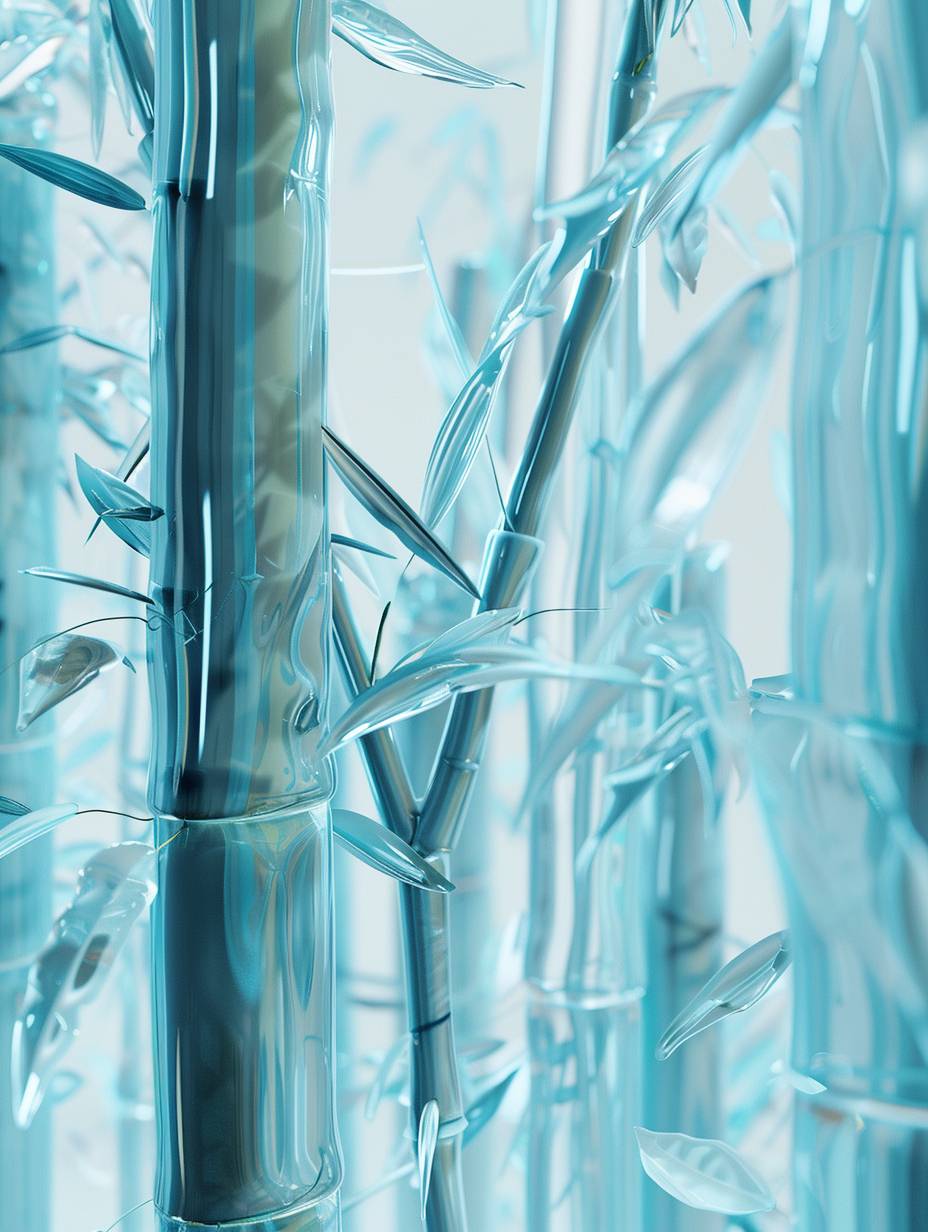 minimalism illustration, 3D rendering , whitebackground, extremely close-up shot, bold Chinese bamboos, glass texture, cyan, translucent-glass melt,Gradient color, front view, high quality, super detail, 8k, --ar 3:4 --v 6.0