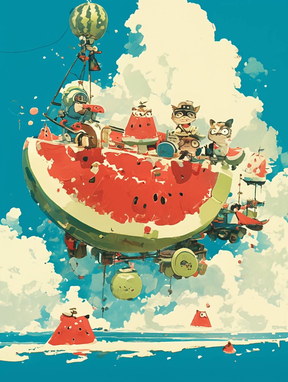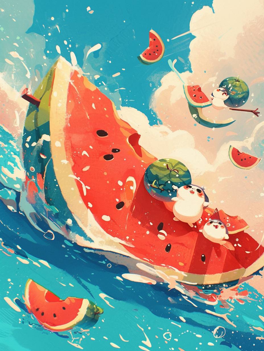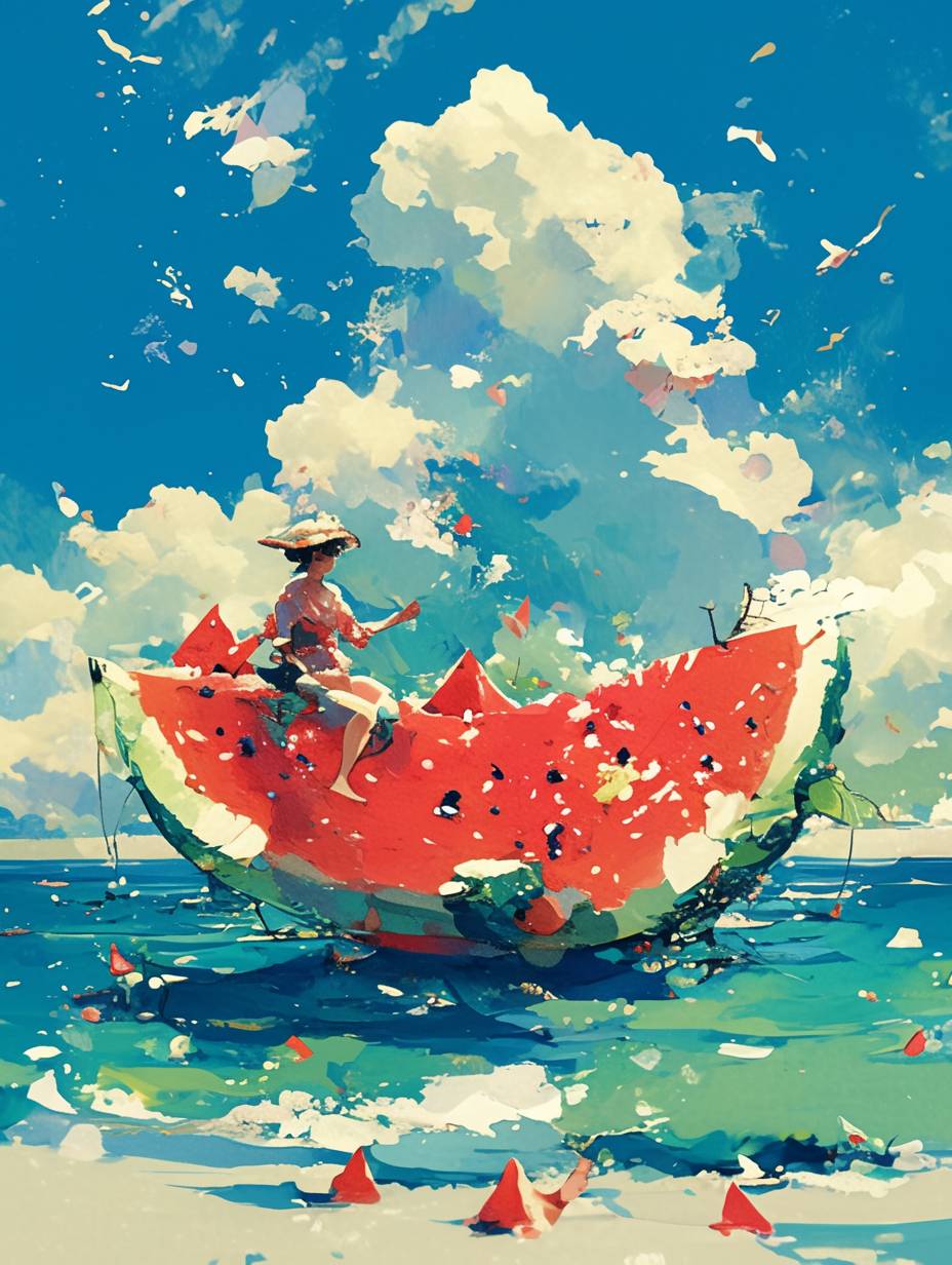 illustration of a watermelon boat floating on the sea, blue sky and white clouds, cute cartoon design, watermelons scattered around, fantasy landscape background, Asian painting style, Pixar style, soft shading, emotive fields of color, Minimalist style, ethereal landscapes, red and yellow, lovecore style, elegant brushes --ar 70:93 --s 750 --niji 6 --style raw