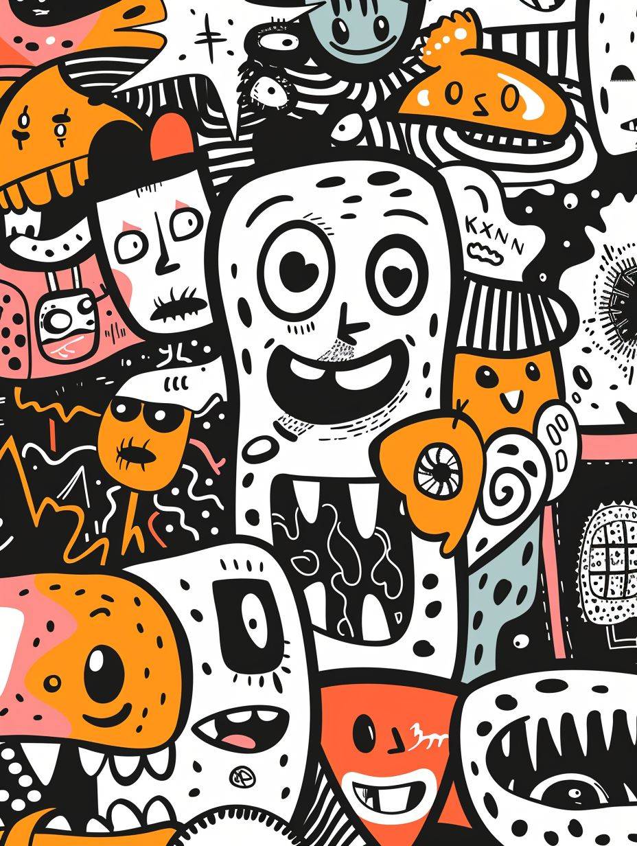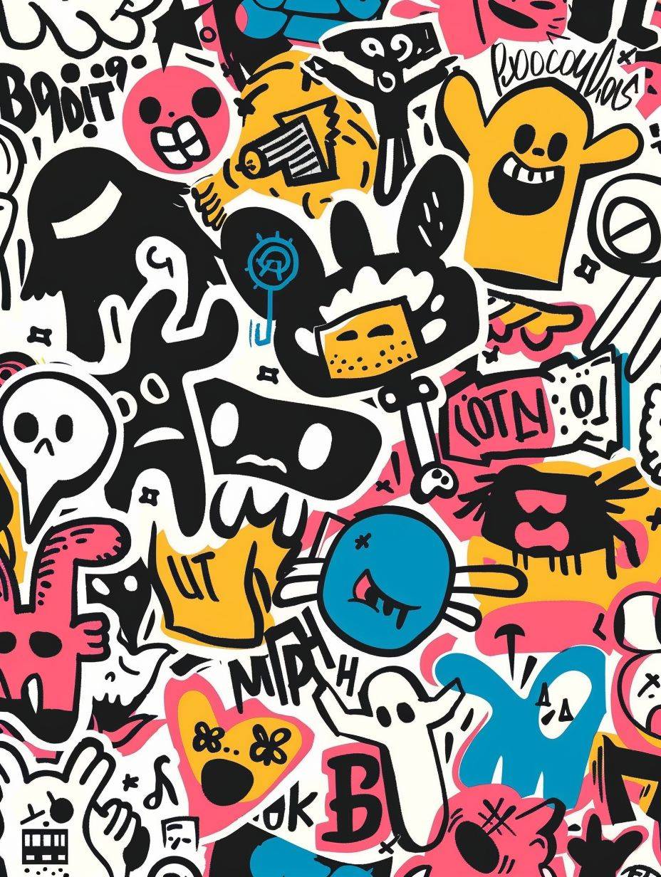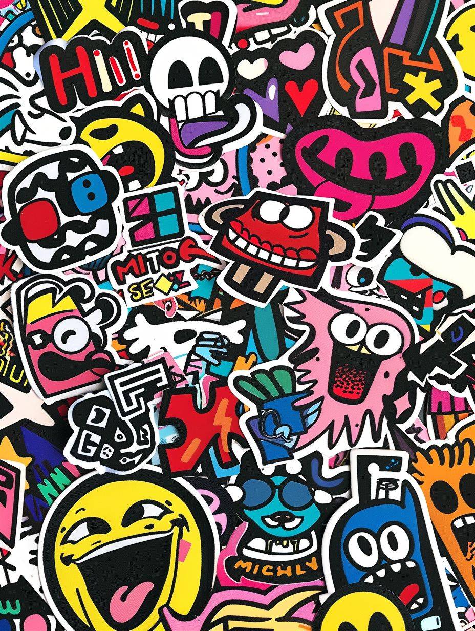 Various Patches, Pins, Stamps, Stickers.,Funny cute comic Characters. Different Phrases and words.,Hand drawn trendy Vector illustration. Cartoon style,Set of three Abstract square seamless Patterns.,Keith Haring style --ar 3:4