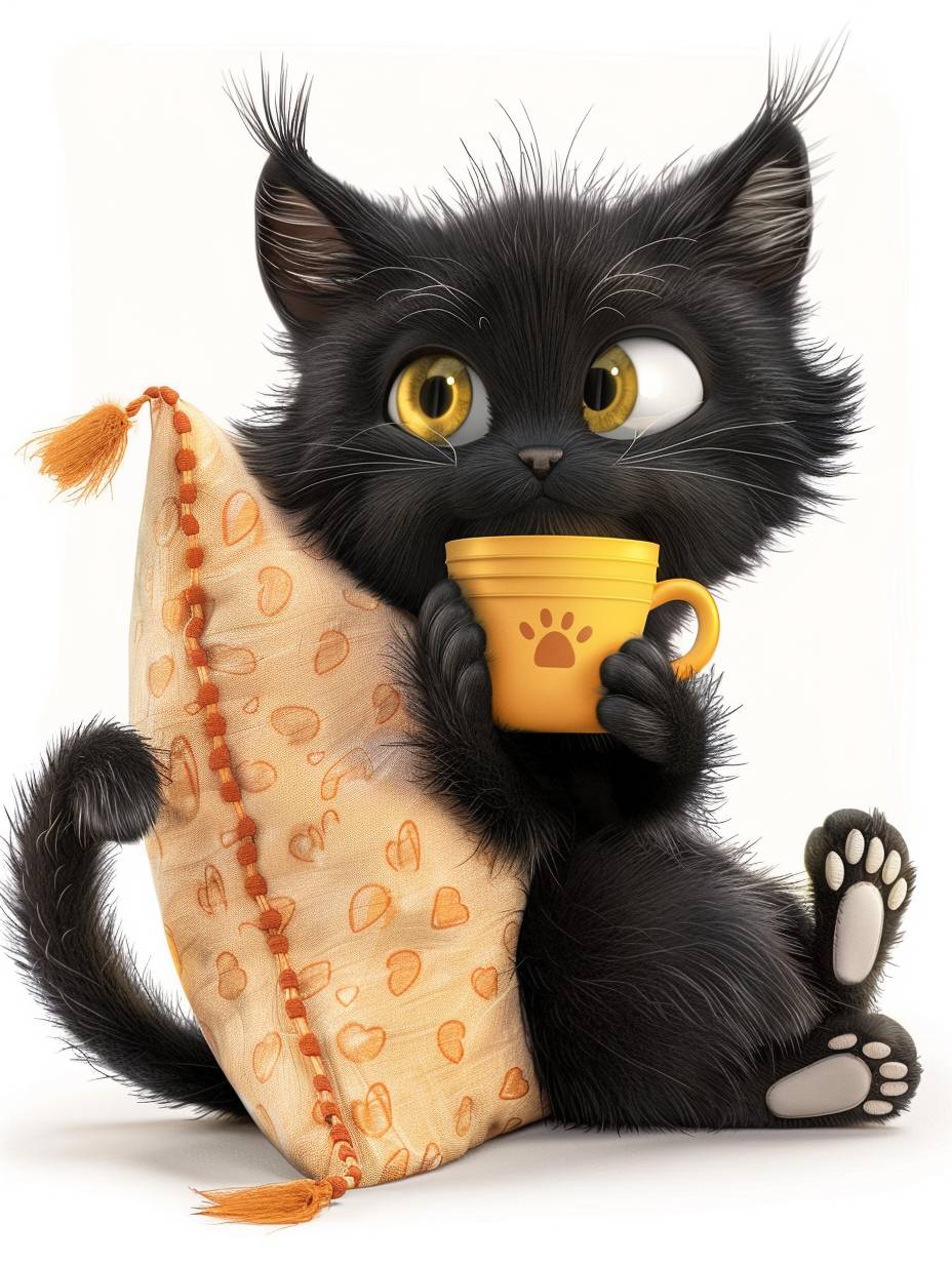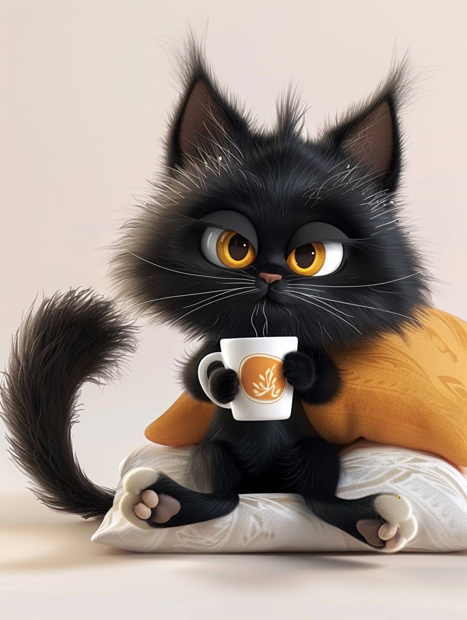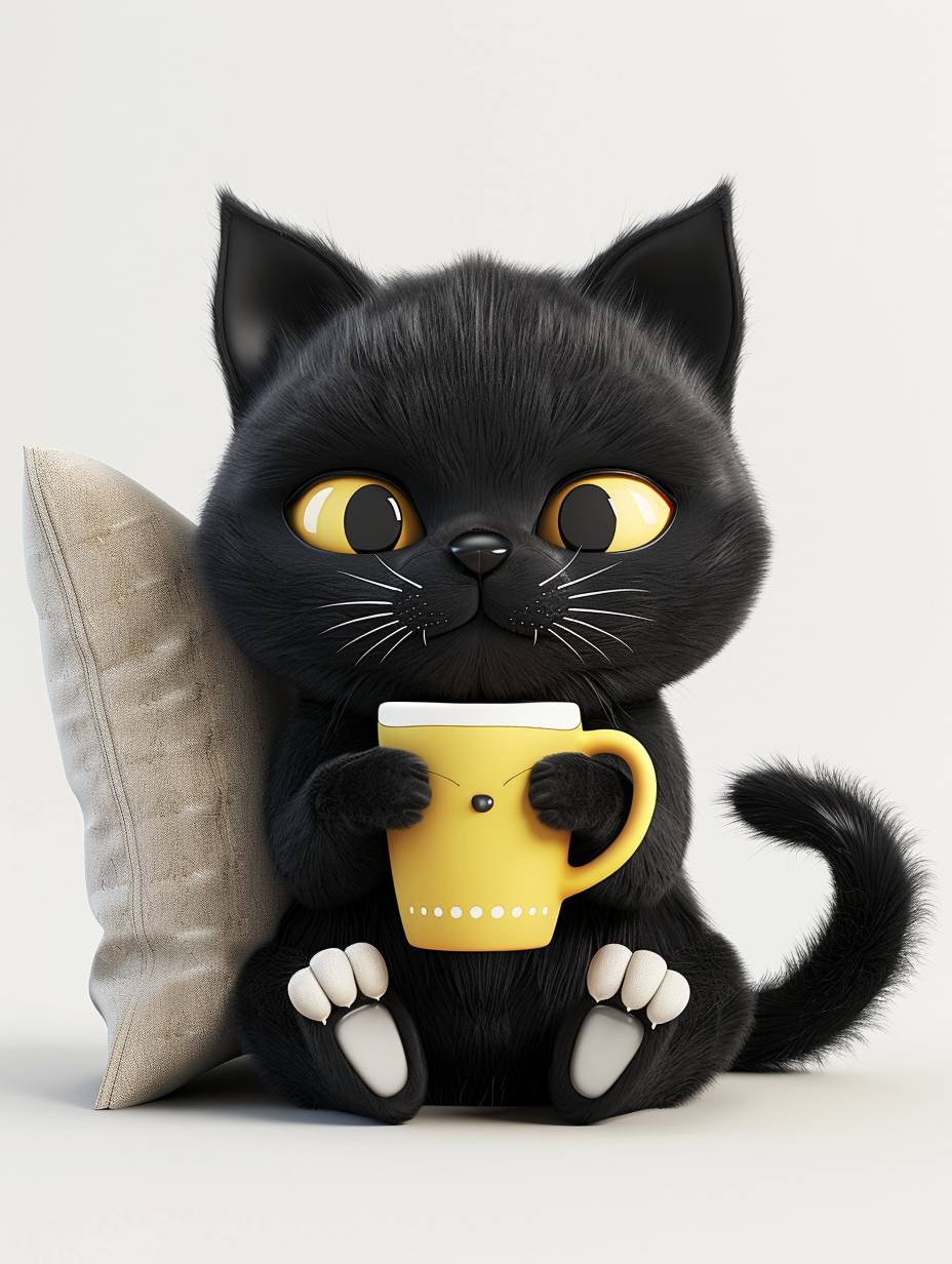 Cute black cat sitting with his back against a throw pillow drinking coffee, cartoon character design and high resolution 3D rendering, cute with adorable expression, white paws holding a cup of coffee, yellow eyes, fluffy, black tail --ar 3:4 --v 6.0