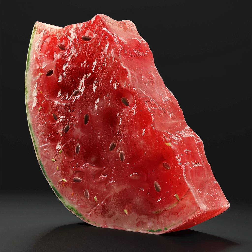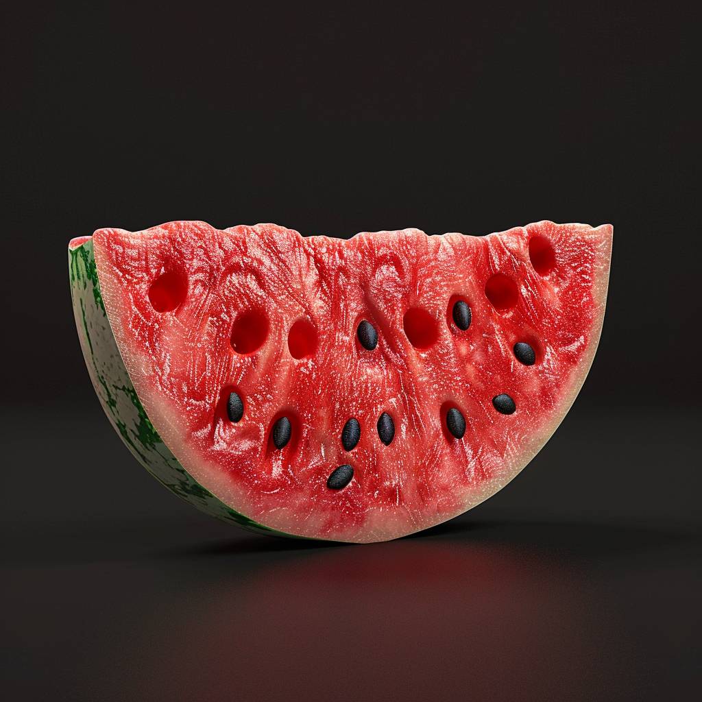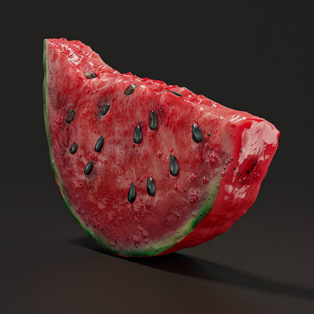 Enhanced side angle photorealistic 3D shape view of a [SUBJECT] composed entirely of the red pulp of juicy watermelon, appearing natural and lifelike. Focus intensively on the pulp juicy texture, ensuring it vividly represents the juicy, glistening nature of pulp. The [SUBJECT] form should be exceptionally detailed, with clear, realistic watermelon pulp fibers and 5 seeds that are accurately portrayed in size and distribution. The contrast with the dark background should be optimized --v 6.0