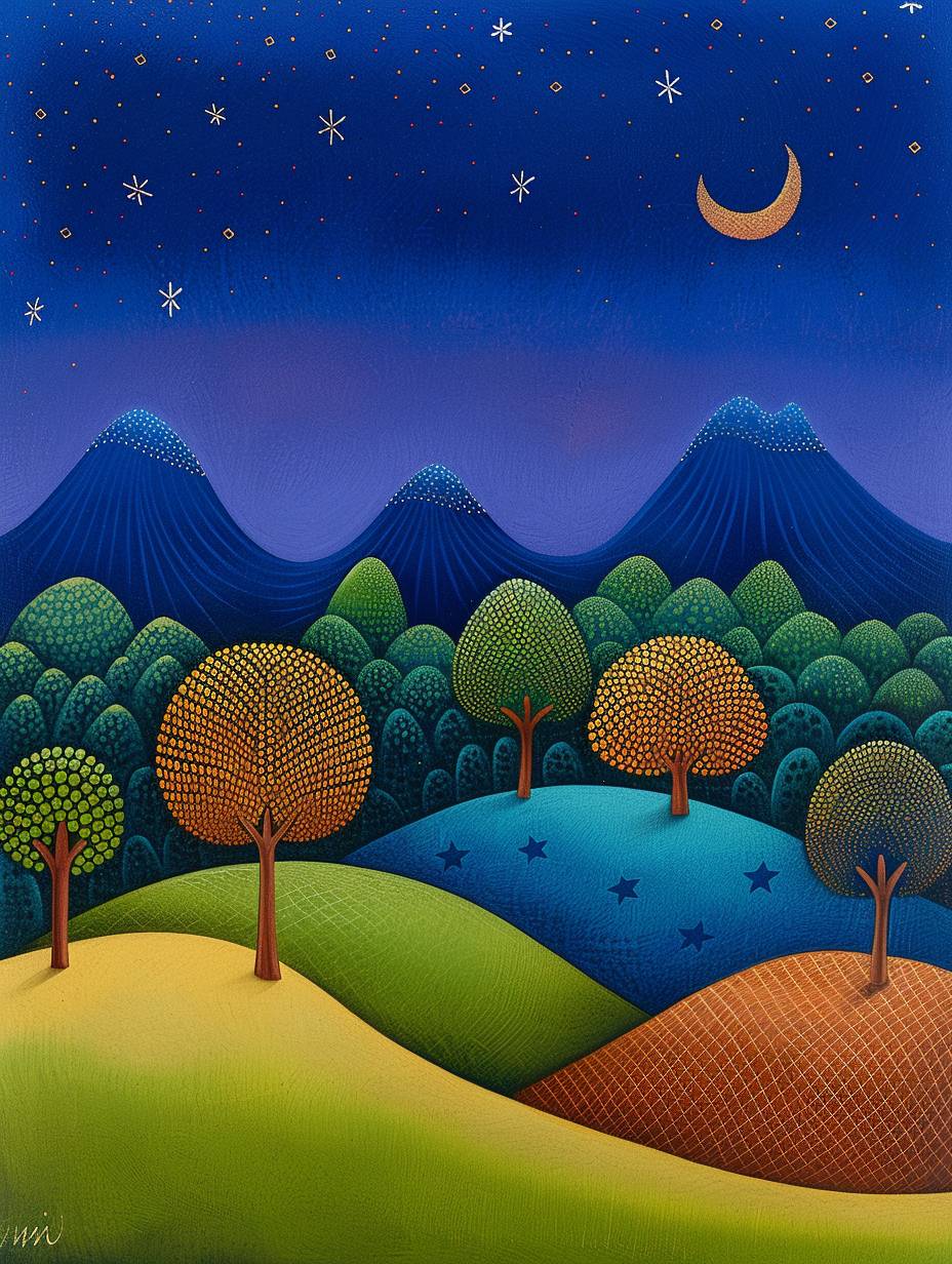 A forest scene with strange hidden creatures, autumn leaves, star filled night sky, sunset, loneliness, by Gustave Klimt --chaos 100 --ar 3:4 --style raw --personalize bp8kqyt --stylize 1000 --v 6.0