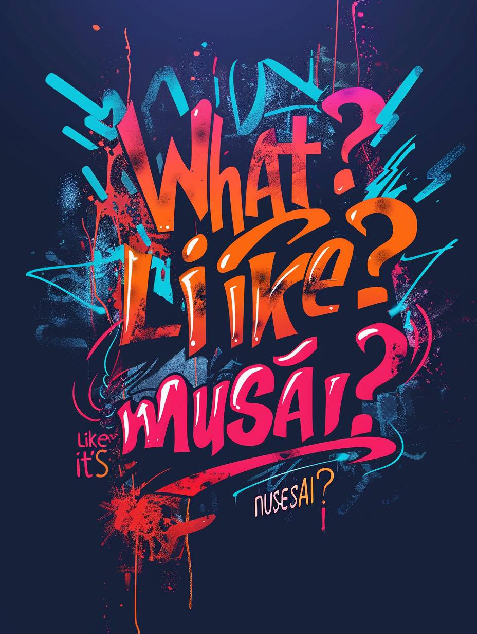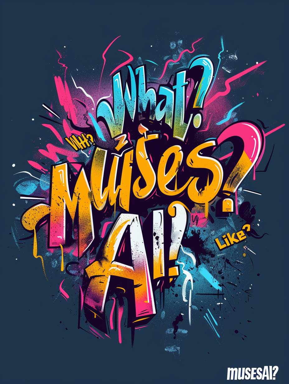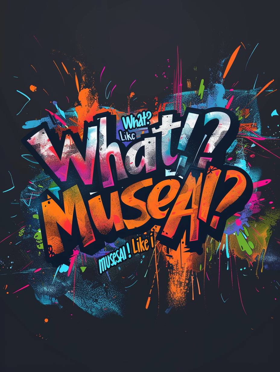 A bold, attention-grabbing graffiti style logo with the words "What? Like it’s musesAI?" written in vibrant, dynamic colors.The letters are spray-painted in a chaotic yet artistic manner, with sharp edges and angles giving it an edgy vibe. The background is a dark, moody color that accentuates the brightness of the text, creating a striking visual contrast. --ar 3:4 --v 6.0