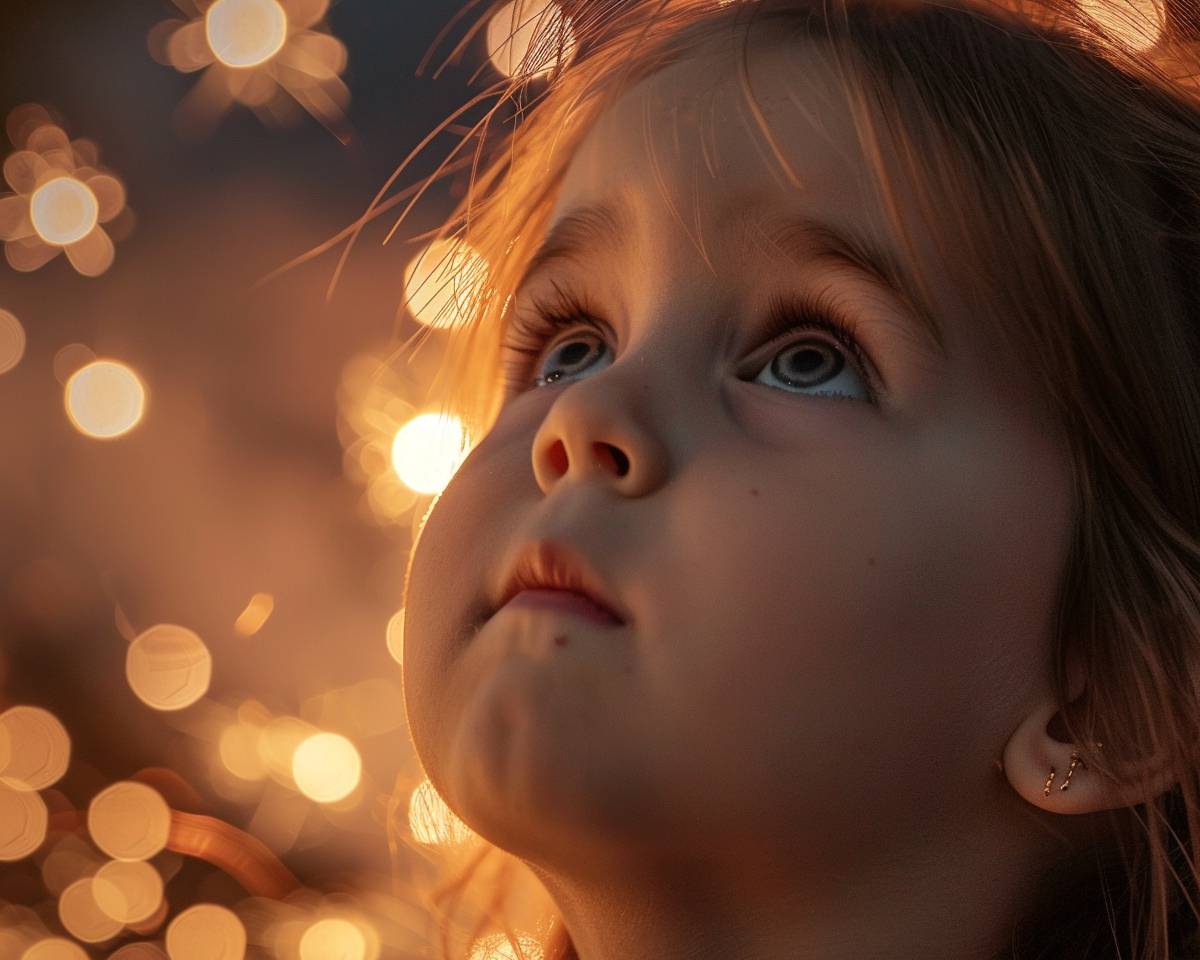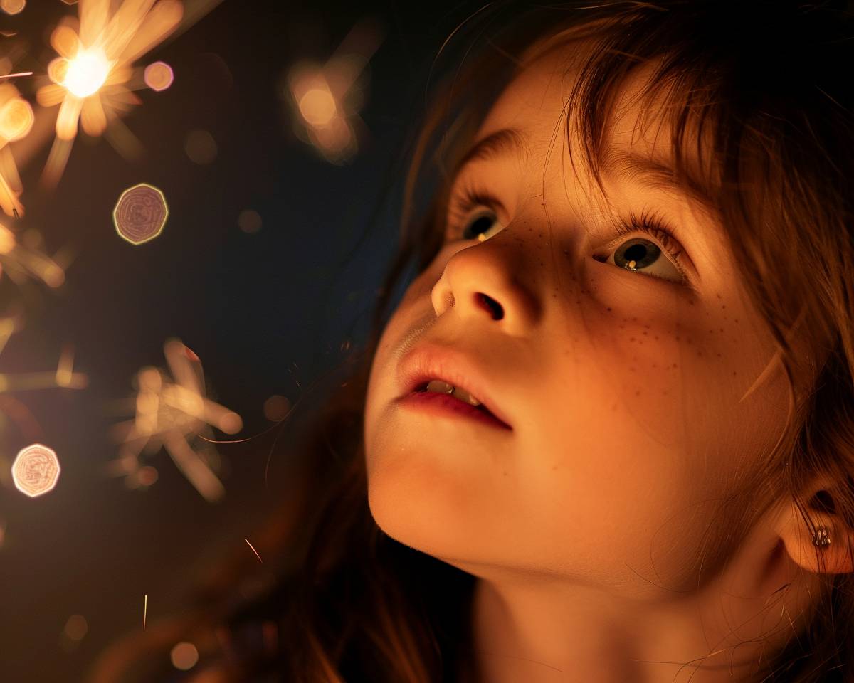 A close-up of a little girl looking up at fireworks in the night sky, highly detailed, clean and neat, interior photography, professional photography, photorealistic, 4k, taken with a Canon EOS R5 at F16, ISO 1600 with a focal length of 100MM.