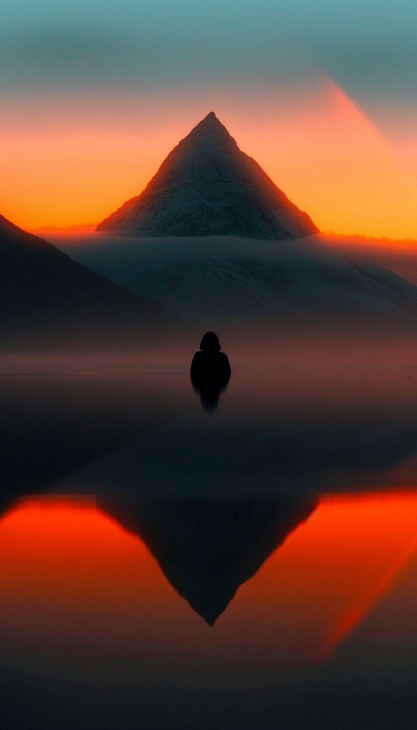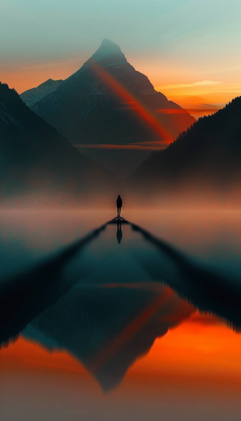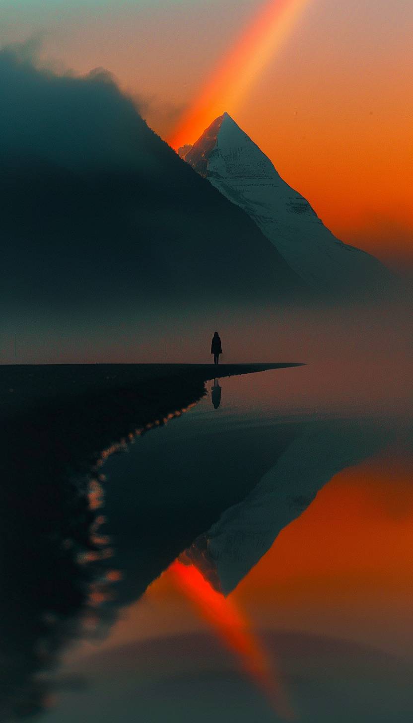 A lady reflecting over a mountain lake, with a rainbow reflected on the surface, creating a cinematic and serene landscape at sunrise.
