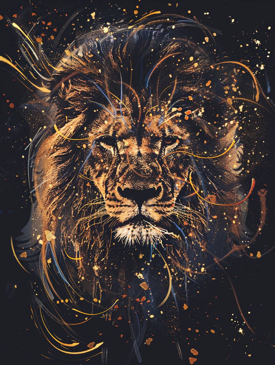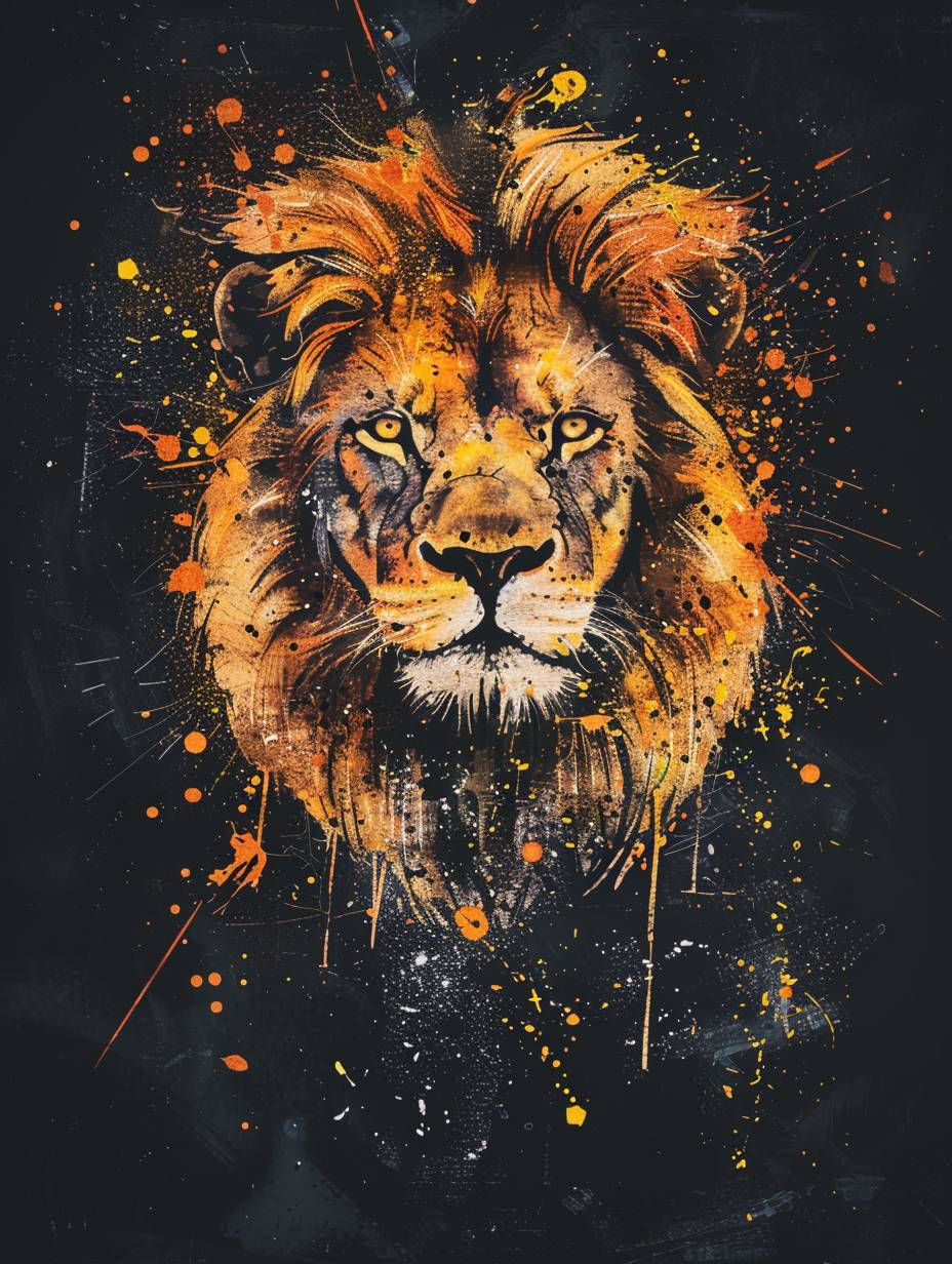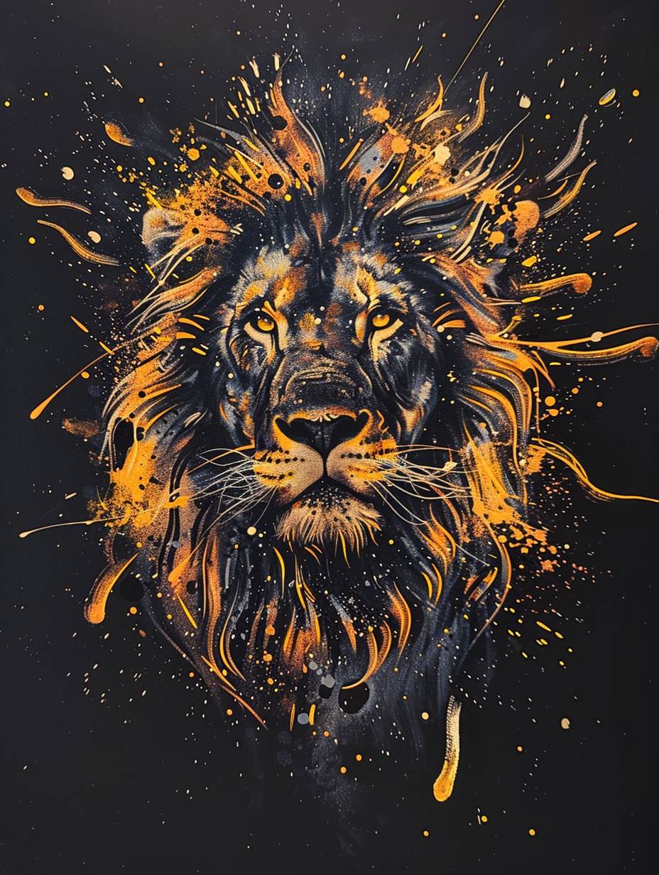Majestic lion painted in a style with colorful paint splatters, using amber and gold colors on a black background.