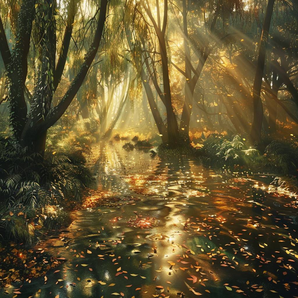 A photorealistic depiction of a dense Aztec Central American mystical forest, bathed in golden afternoon light streaming through ancient willow trees. Long, ghostly shadows are cast on the forest floor covered with fallen leaves, ferns, and small glowing electrical flowers. A magical morning stream flows through the vibrant scene, reflecting the surrounding foliage's colors and light, creating a serene and enchanting atmosphere.