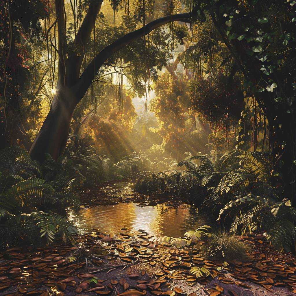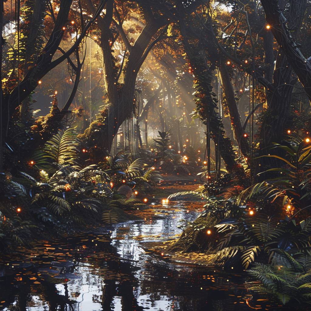 A photorealistic depiction of a dense Aztec Central American mystical forest, bathed in golden afternoon light streaming through ancient willow trees. Long, ghostly shadows are cast on the forest floor covered with fallen leaves, ferns, and small glowing electrical flowers. A magical morning stream flows through the vibrant scene, reflecting the surrounding foliage's colors and light, creating a serene and enchanting atmosphere. sci-fi landscape, amazon jungle, in an ancient civilization, cinematic, epic realism,64K, ultra highly detailed, lifestyle photography, candid, realistic, epic realism, portrait, utra high quality, hyper realistic, long exposure lighting, spotlight, natural lighting, soft lighting, diffused, epic realism, high quality, hard lighting, backlit, dreamy vibe --v 6.0