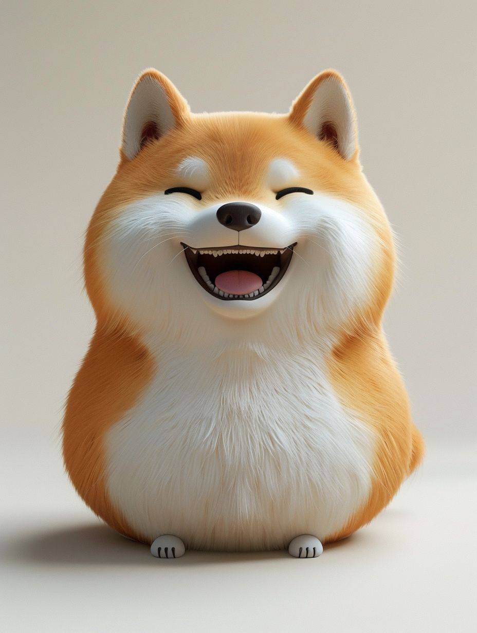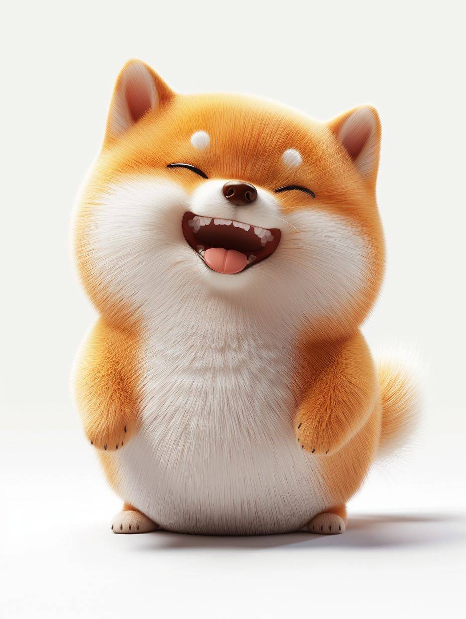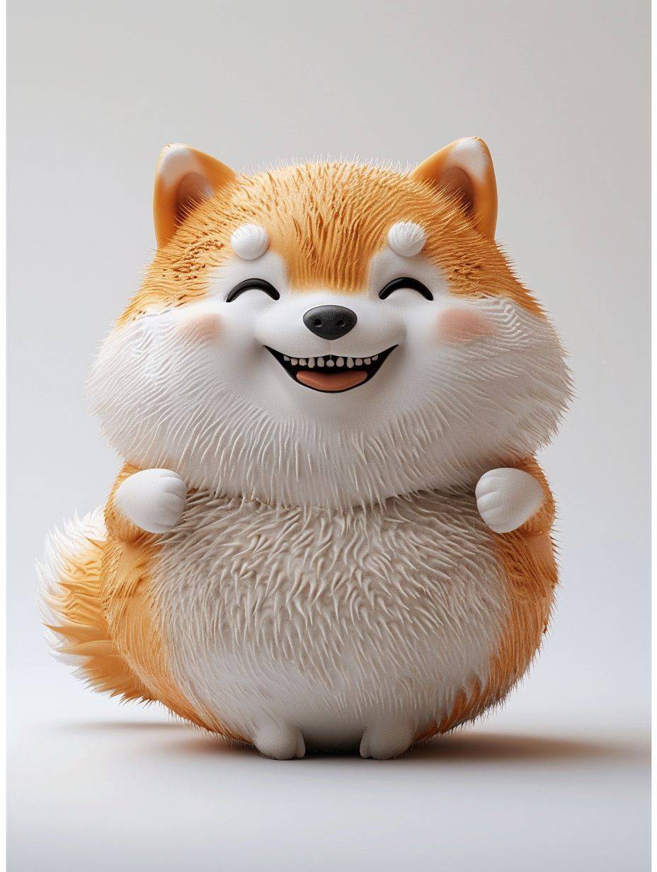 This is a cute fluffy little Shiba Inu with funny facial expressions and exaggerated movements, in a 3D cartoon style against a minimalist white background.