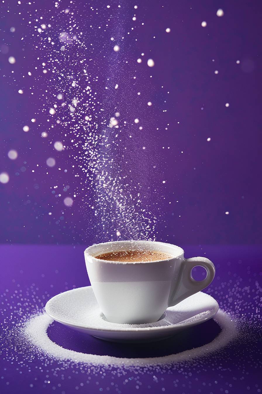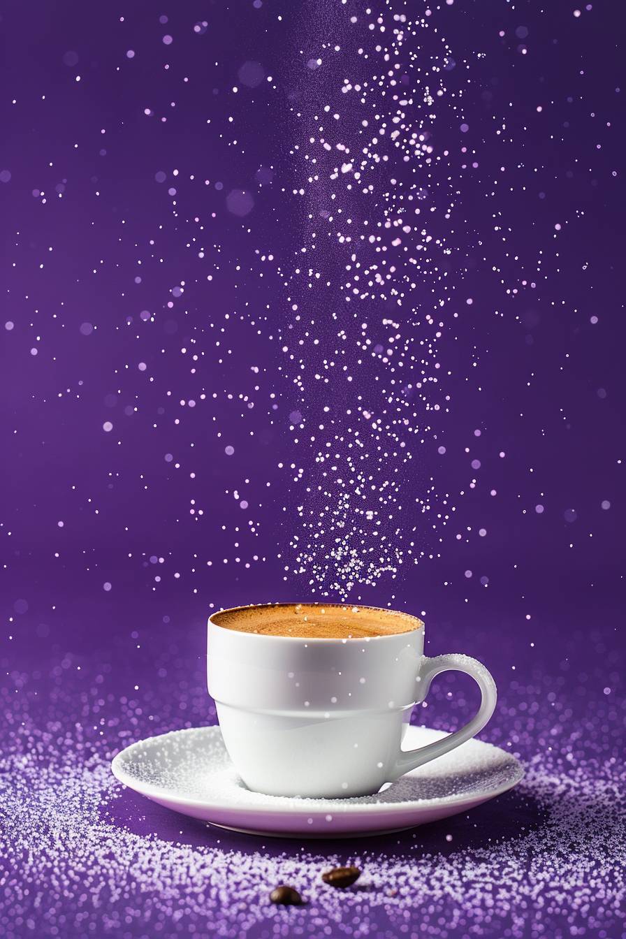 Espresso coffee with milk, wallpaper, 4k, granulated sugar falling down, cup, purple color background, front view--v 6.0 --ar 2:3 --v 6.0