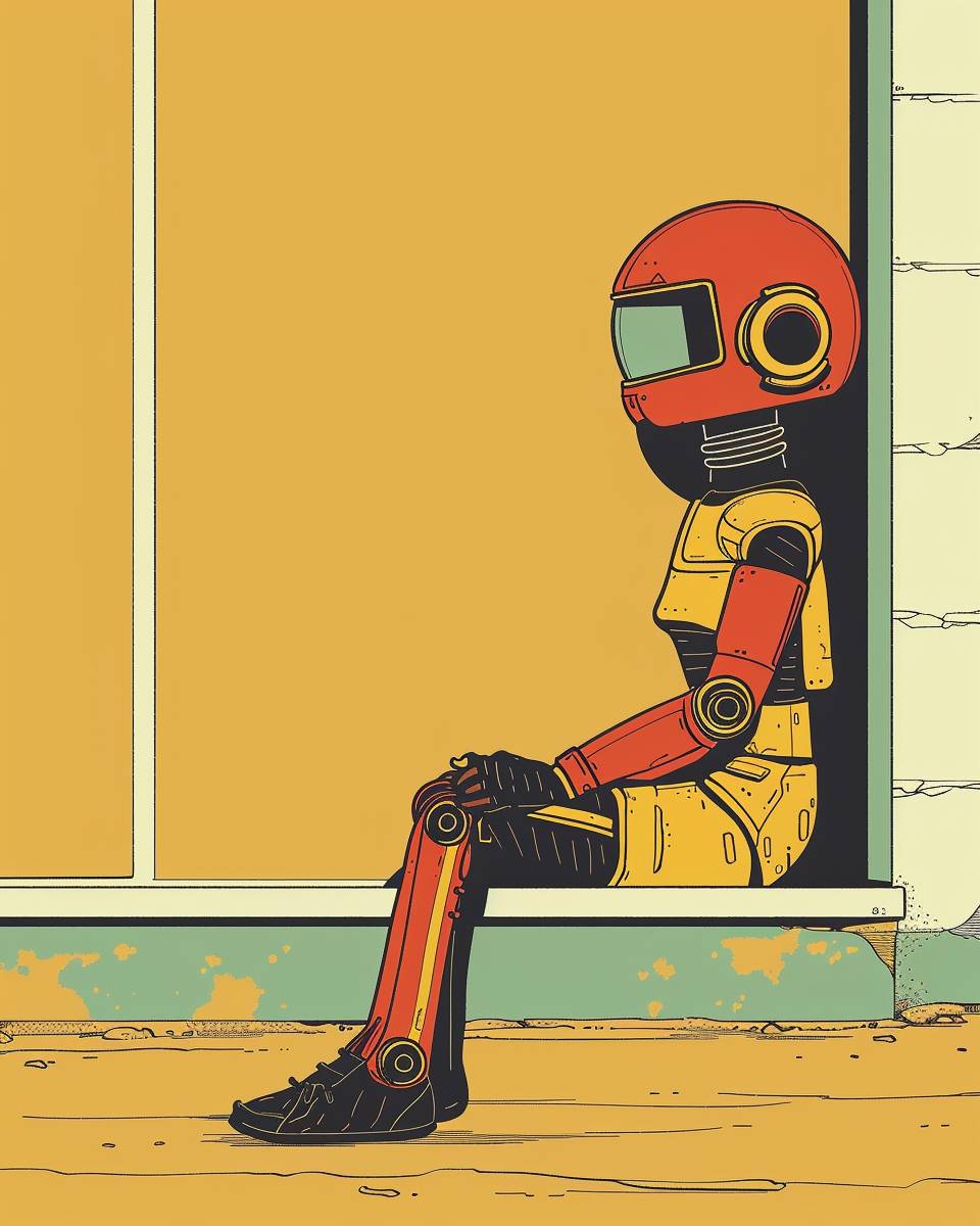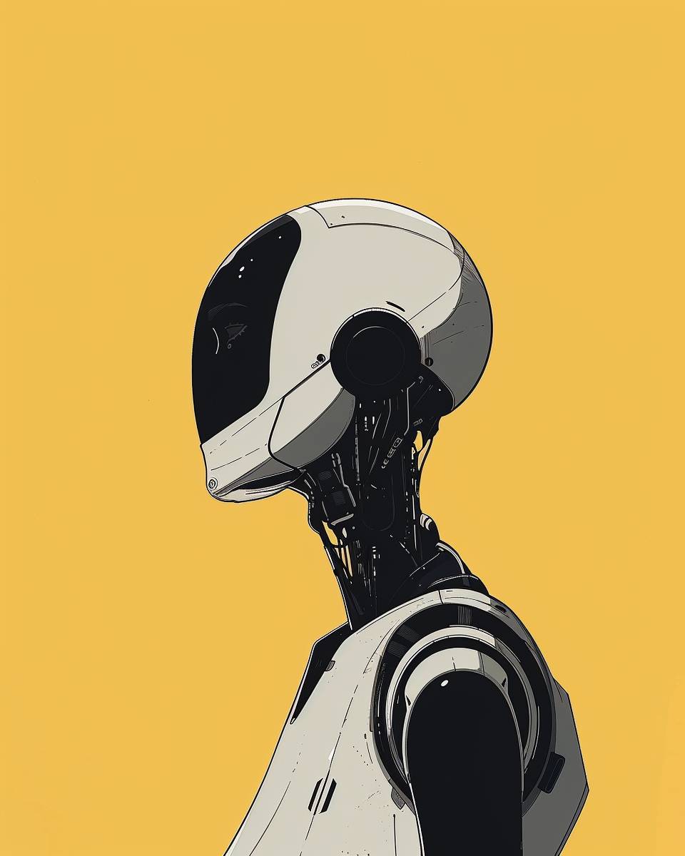 A beautiful robot woman, peaceful serenity, small scene, hand-drawn style, no shading, Chris Ware style, Kate Beaton style, Naoki Urasawa, sharp illustrations, bold lines and solid colors, simple details, minimalist Giorgio Morandi color scheme, yellow background
