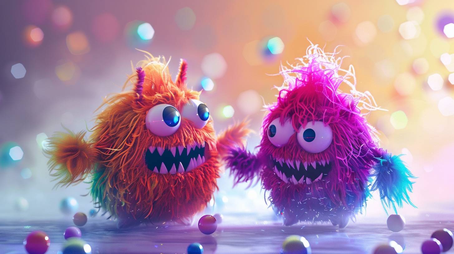 3D cartoon animation of two cute and fluffy monsters dancing, with vivid colors
