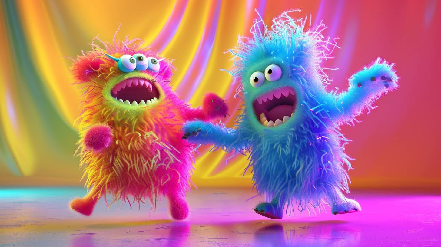 3d cartoon animation of two cute and fluffy monsters, dancing, vivid colors --ar 16:9 --v 6.0