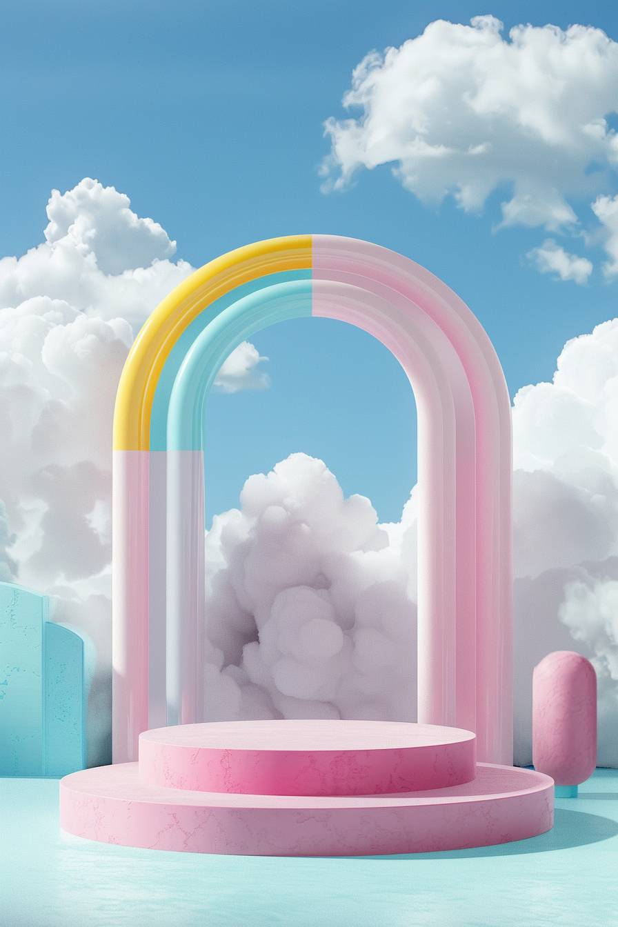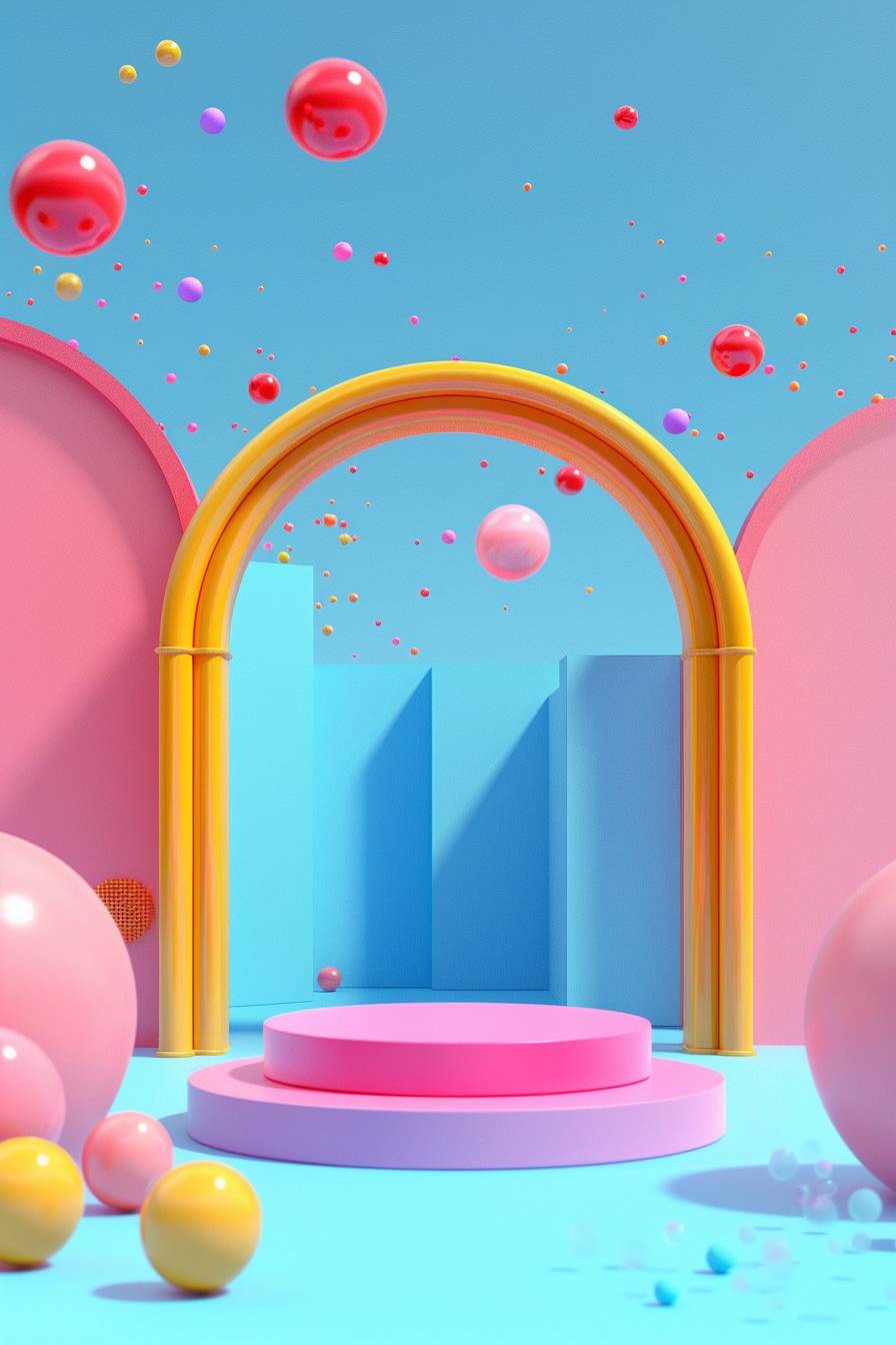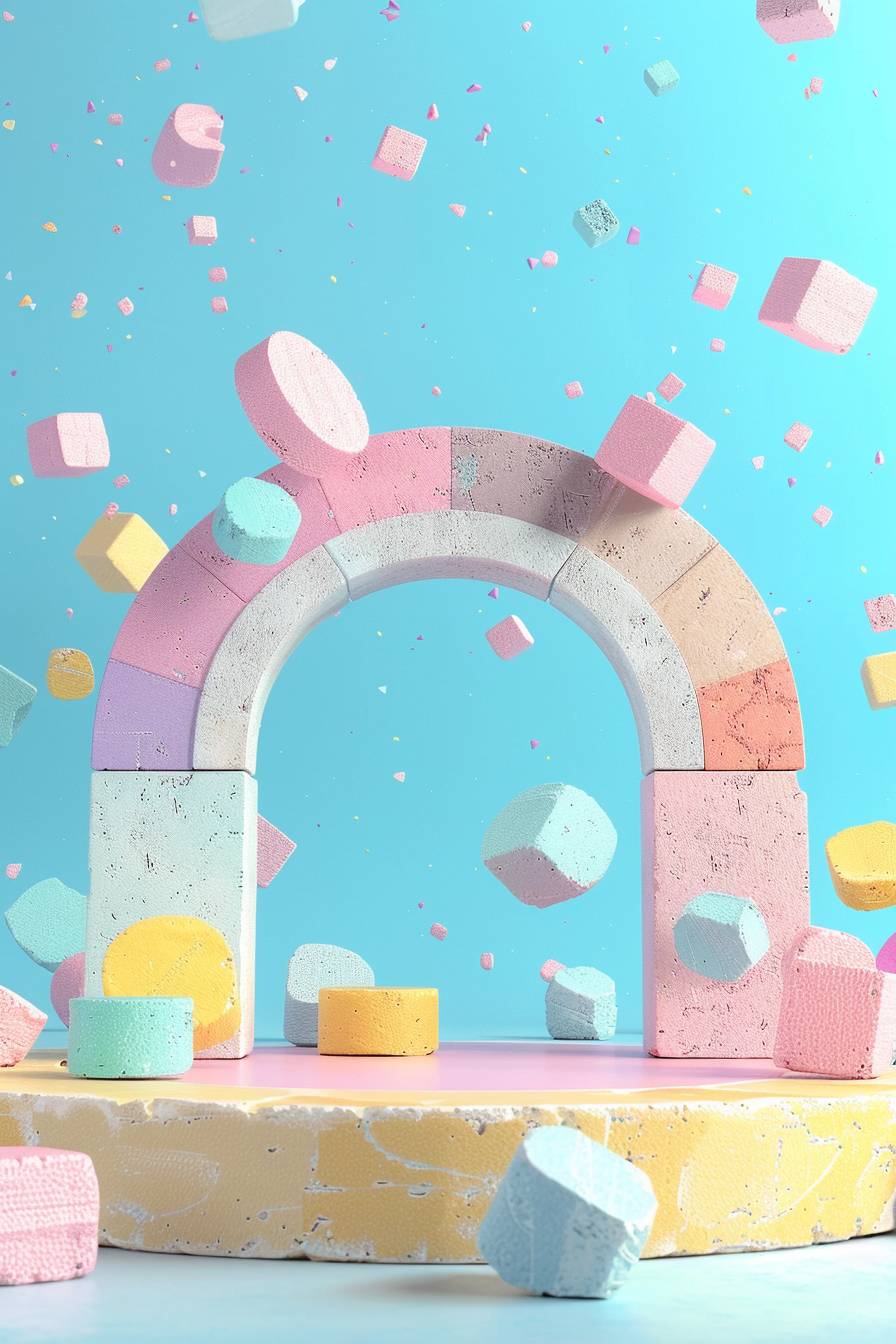 On the podium, simple style, bright, the background is an arch made of colorful building blocks, pink background, sky blue background, bright environment, c4d, Octane Render