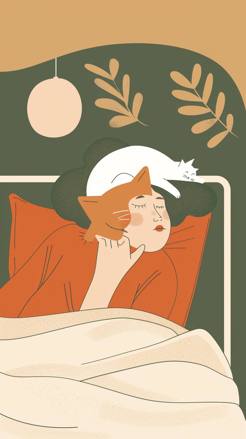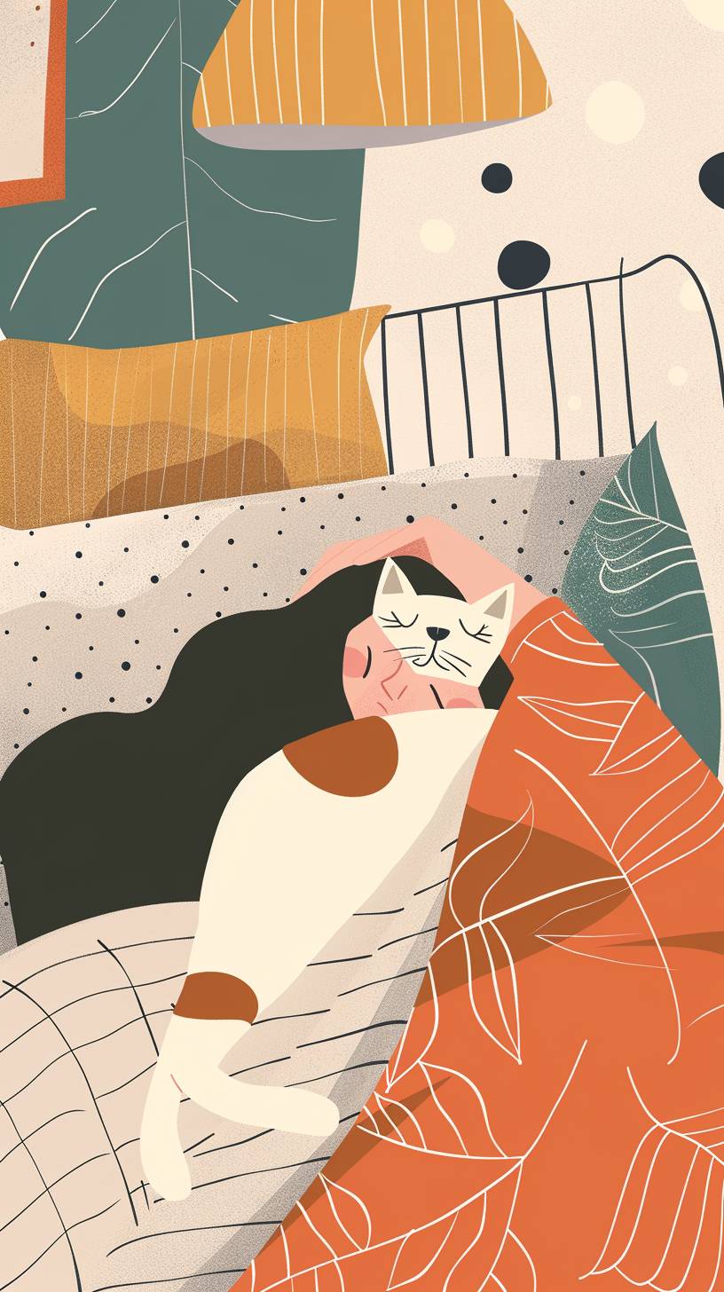 A flat illustration of a woman sleeping in a bed with a cat lying on her head, minimalist, warm, utilitarianism, geometric, danish design --ar 9:16 --stylize 50 --v 6.0