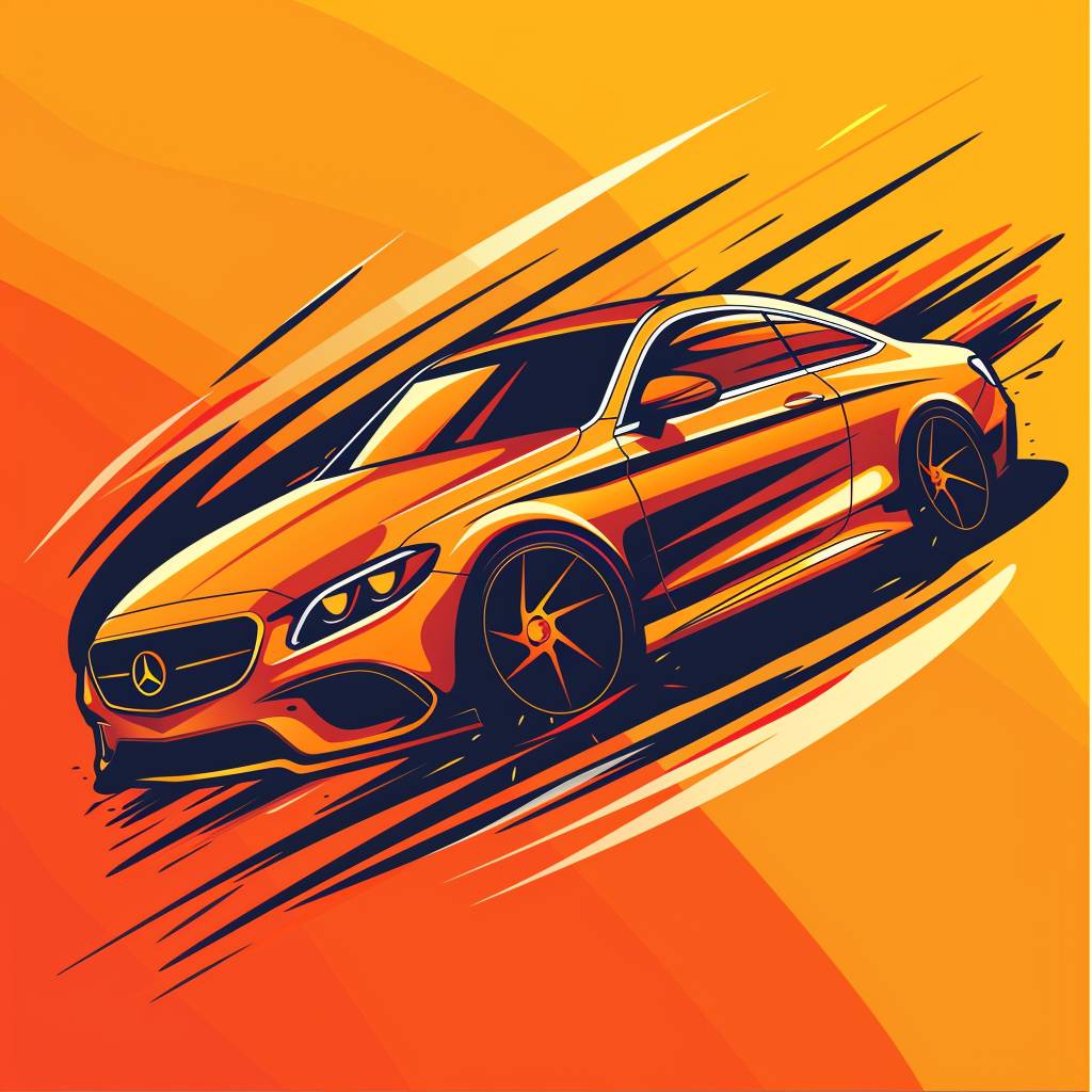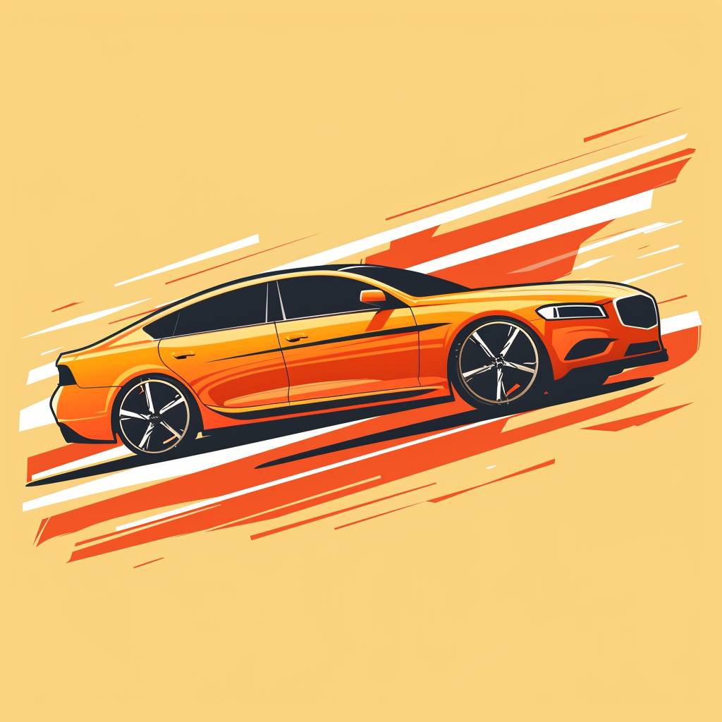 A pop art style digital logo featuring a sleek sedan from a diagonal angle, with flowing lines and vibrant orange colors. The background is minimalistic, emphasizing the car's dynamic and stylish design, HD quality, vivid style.