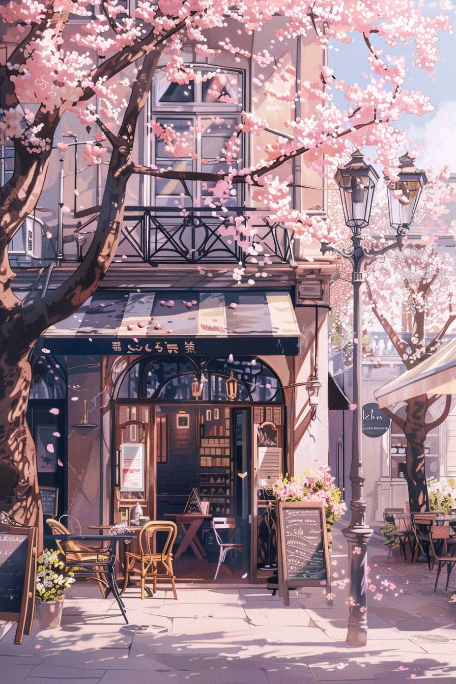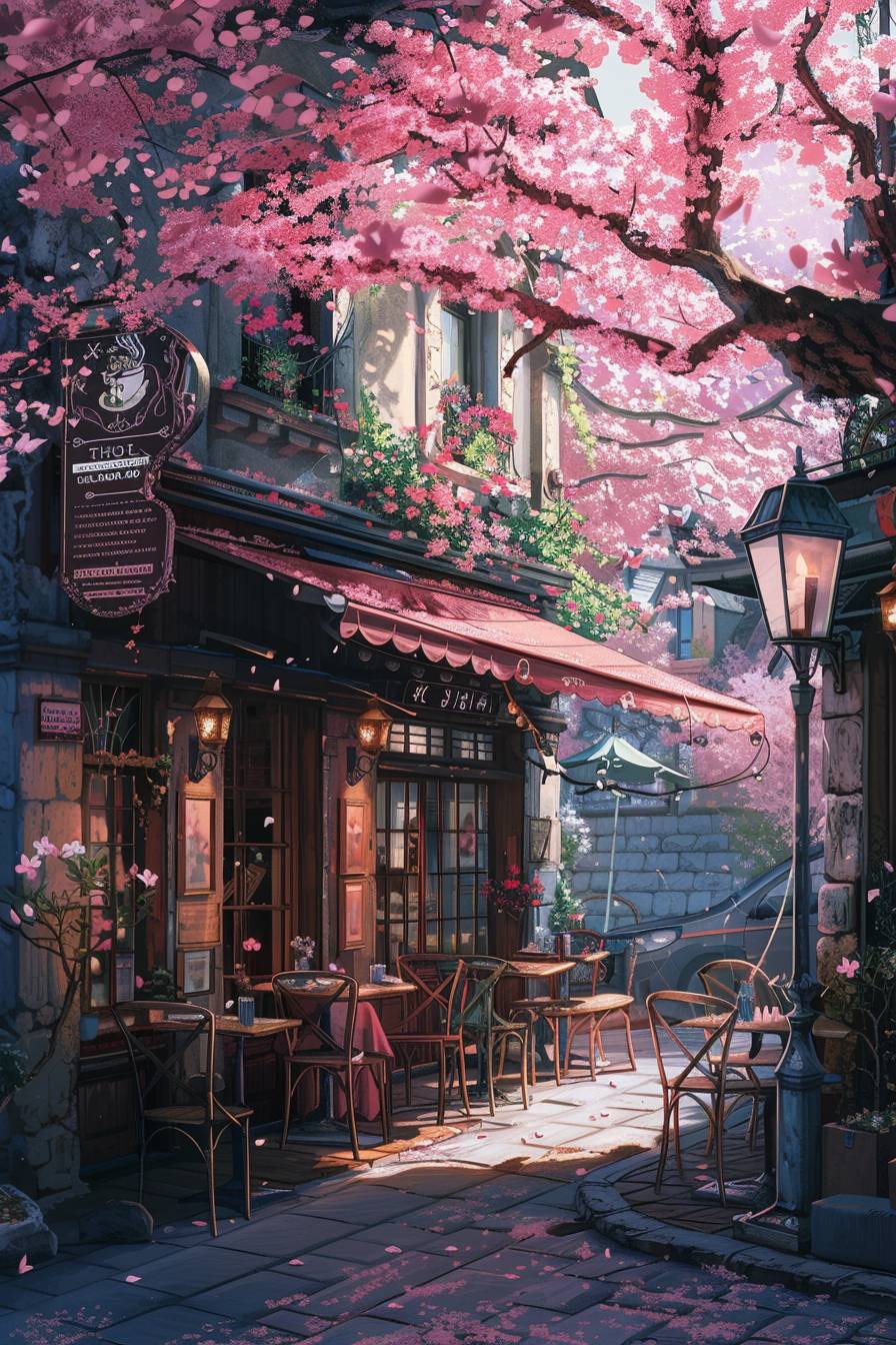 A charming cafe in an old European city, surrounded by cherry blossoms.