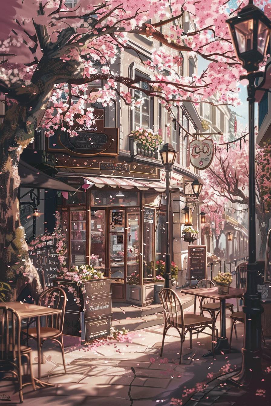 A charming vintage cafe nestled xin the heart of an old Europeancity, surrounded by bloomingcherry blossom trees andadorned with classic streetlamps. The artwork focuses onfaces in the style of anime with apink color tone and cutewatercolor style, rendered withhyper quality --ar 2:3 --v 6.0