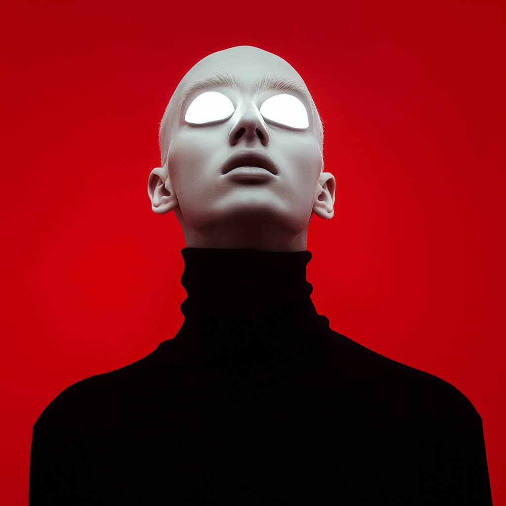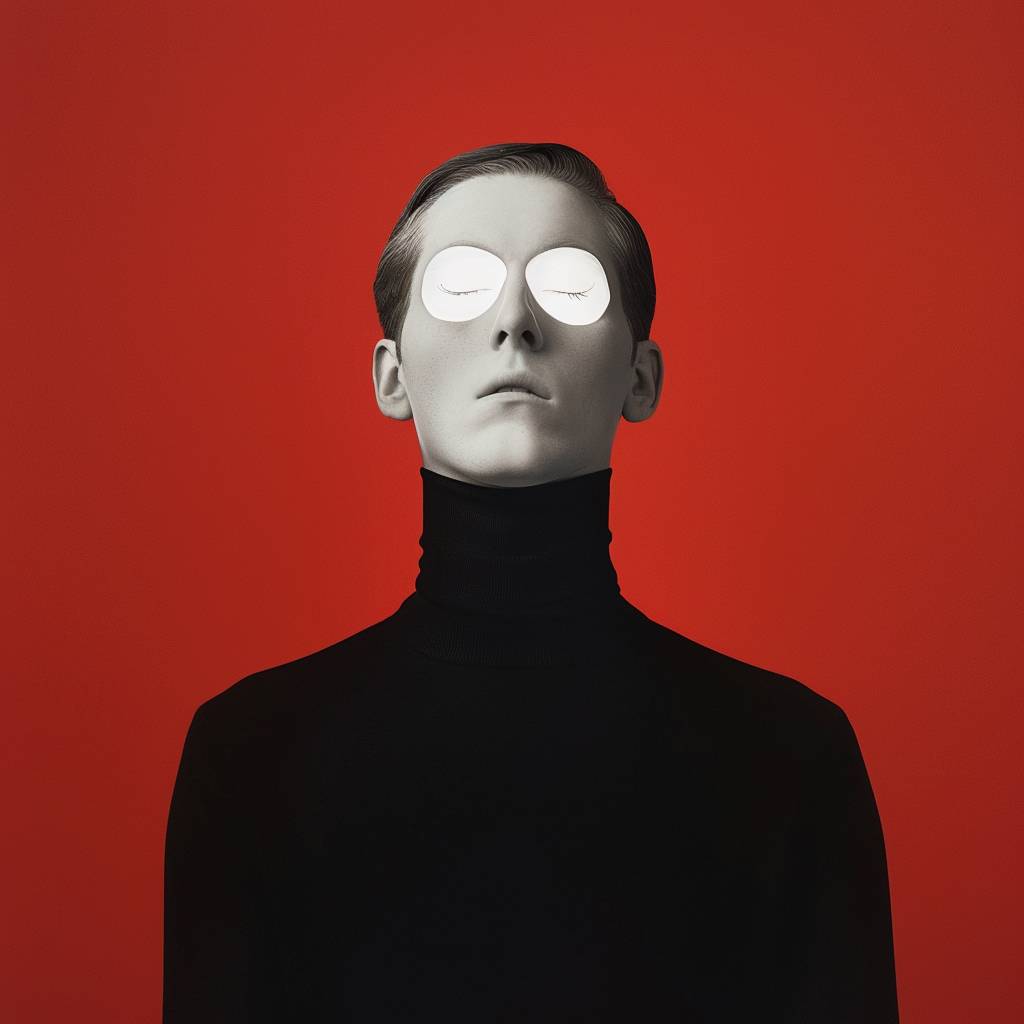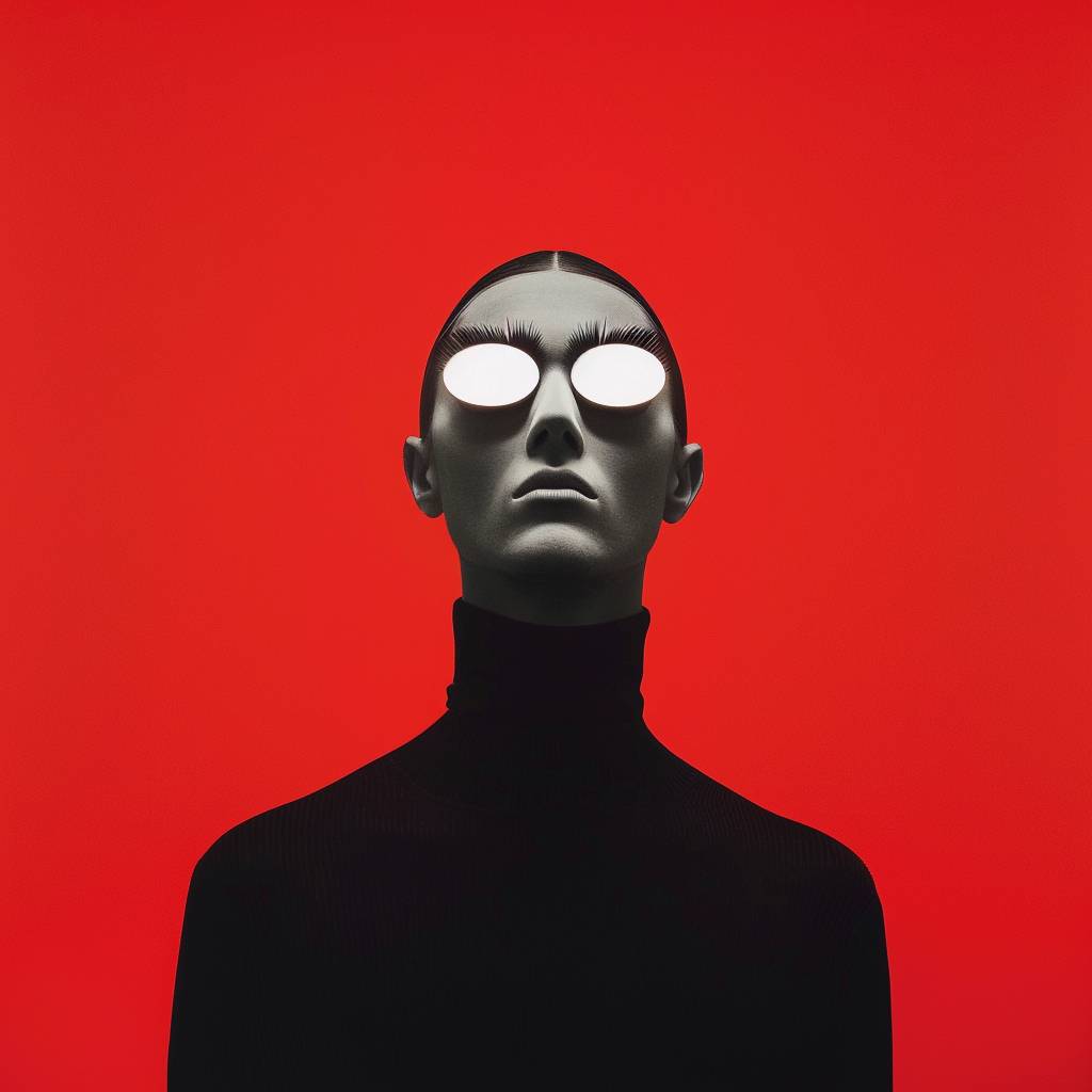 A surreal portrait of a minimalistic man with two white glowing eyes and long thin eyelashes, wearing a black turtleneck and posing in front of a red background.