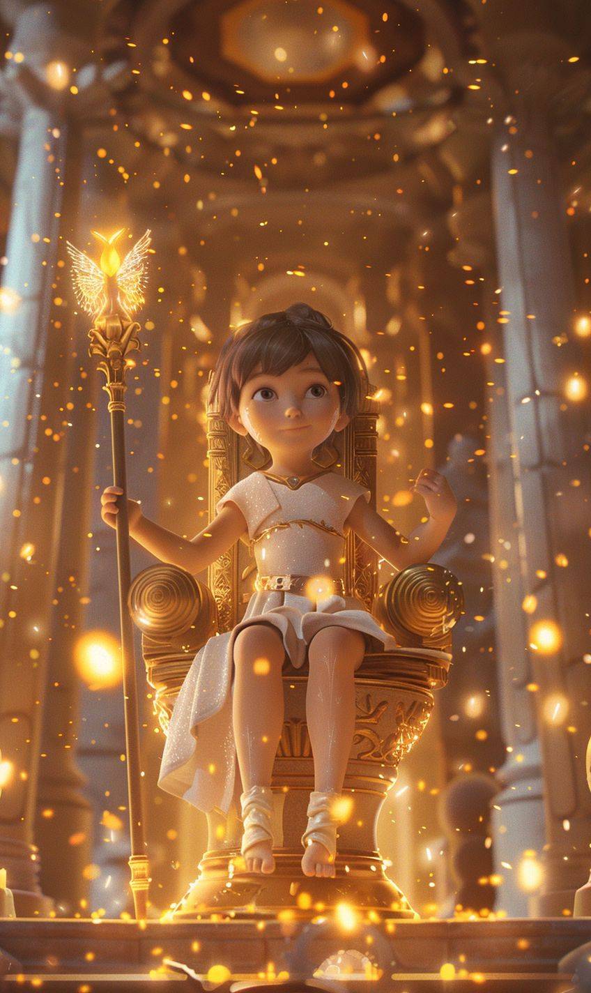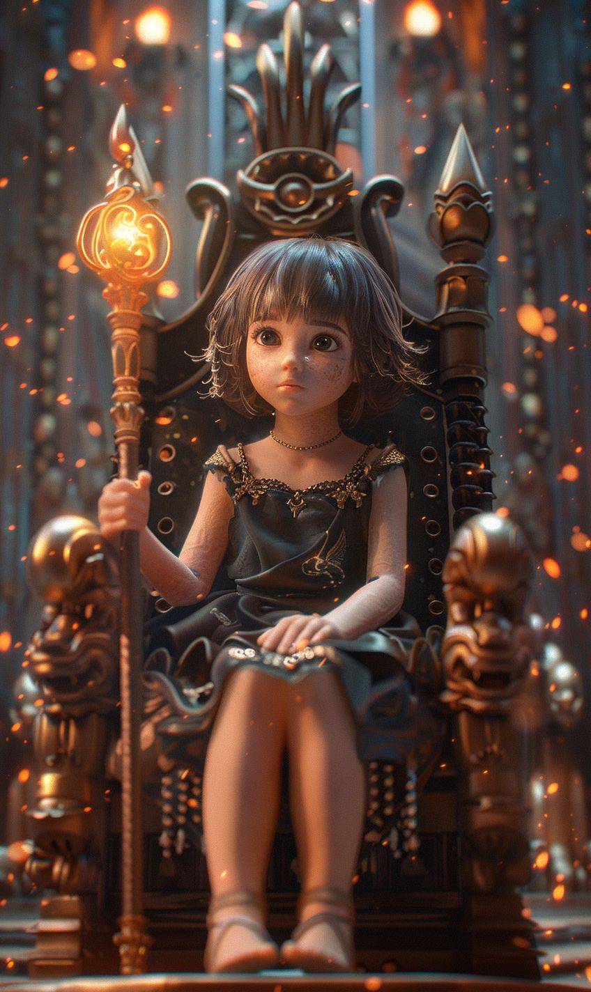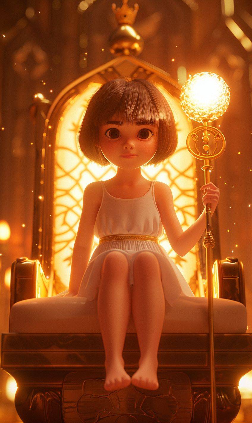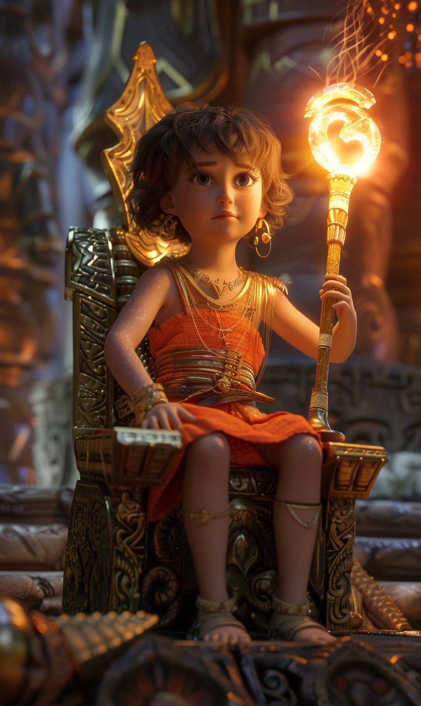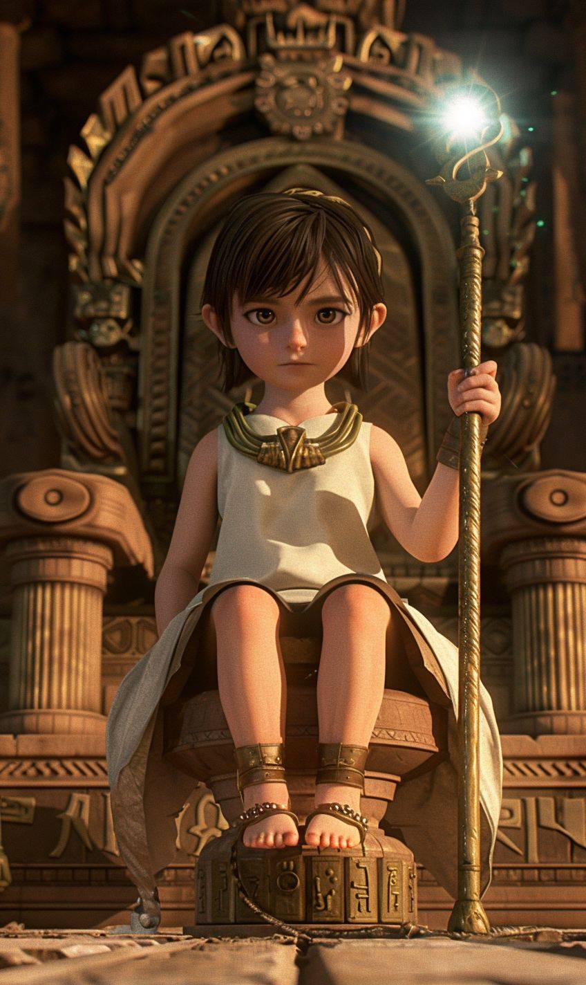 A three-year-old girl with smooth brown hair, cut into a pixie cut and without ponytails, sitting with a serious face on a high pedestal in an ancient temple, on a throne with a magical, glowing staff in her hand. The girl looks funny and cute. do it in Pixar fairytale style. sharp skin, Kodak camera, rtx, --ar 3:5