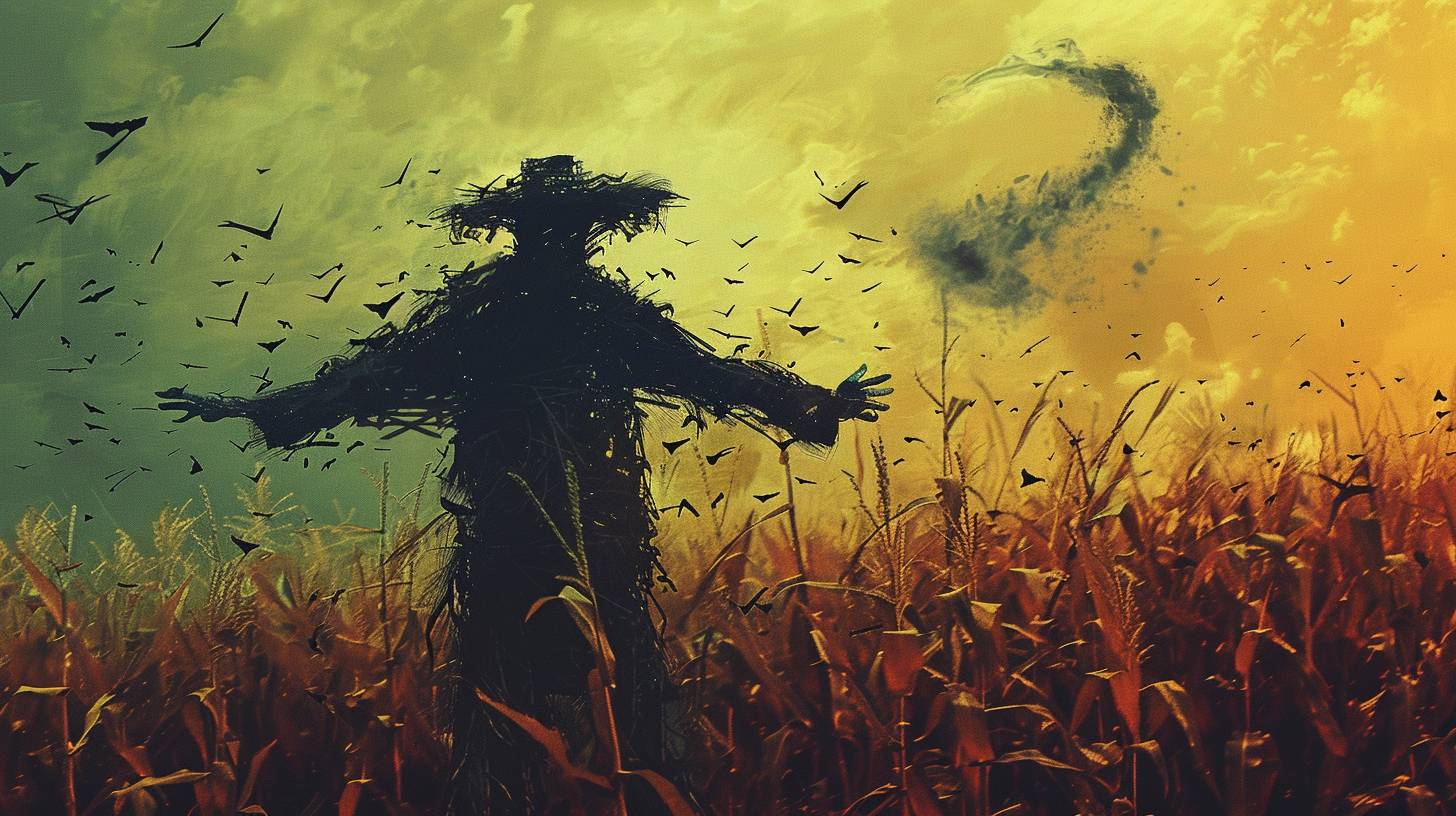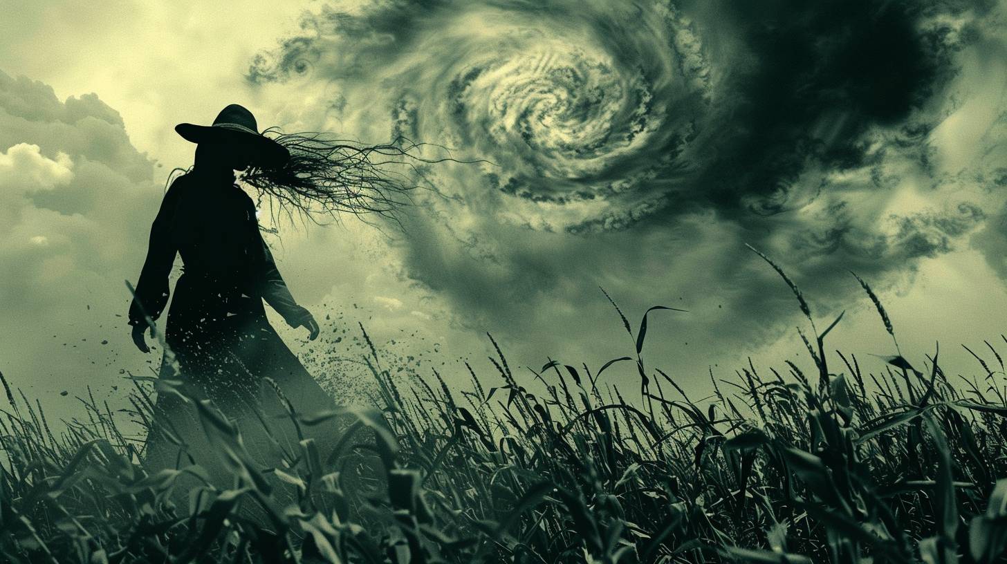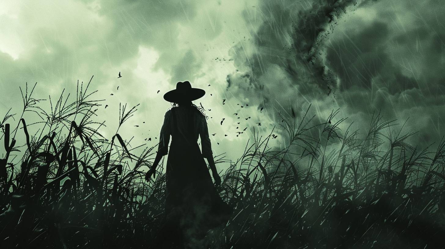 a creepy scarecrow in silhouette, folk horror style, in a cornfield, with a tornado approaching, limited colour palette, tenebrism, strong visual flow --ar 16:9 --stylize 250 --v 6.0